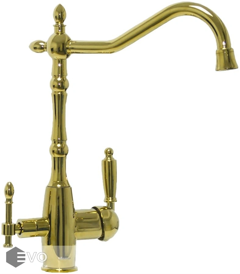 Смеситель Seaman Barcelone SSL-5387 Sun (Polish) - кухонный смеситель со встроенным краном для питьевой воды, выполненный в ретро дизайне. Обладает длинным высоким изливом, который обеспечивает максимум удобства при промывке и наполнении габаритной посуды. Благодаря двухканальной технологии фильтрованная вода не смешивается с водопроводной. Для подачи фильтрованной воды имеется отдельный рычаг управления. Модель великолепно впишется в классическую кухню и привнесет в нее современную функциональность. Смеситель выполнен из высококачественной бессвинцовой латуни. Имеет устойчивую к царапинам и коррозии PVD-отделку цвета золота.