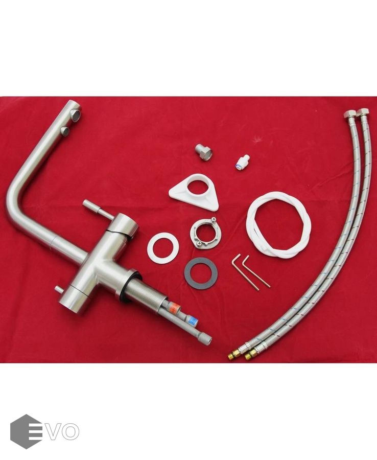 Смеситель поставляется в полной комплектации, необходимой для установки, подключения и эксплуатации (кроме фильтра для очистки воды). В комплект входят: гибкие соединительные шланги — 2 шт. цанга для подключения чистой воды. стабилизирующая пластина для установки на мойках из нержавеющей стали. комплект креплений. трубка 1/4" из пищевого пластика для подключения чистой питьевой воды.
