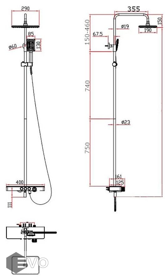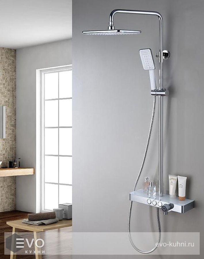 Комплектация: Душевая лейка, Тропический душ, Душевая штанга, Держатель душевой лейки, Металлический шланг, Смеситель, Переключатель, Полка.