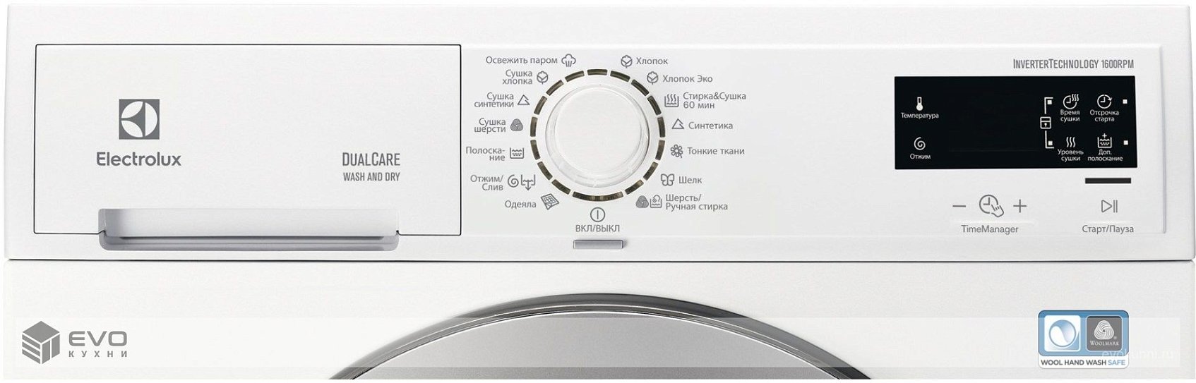 Фронтальная загрузка, стирка 8 кг / сушка 4 кг, отжим 1600 об/мин., классы A/A, глубина 52 см, средний цифровой ЖК дисплей, инверторный двигатель, технология стирки EcoValve, конденсационная сушка, разглаживание и освежение белья при помощи пара, серебристый люк, WOOLMARK BLUE WASH&DRY.