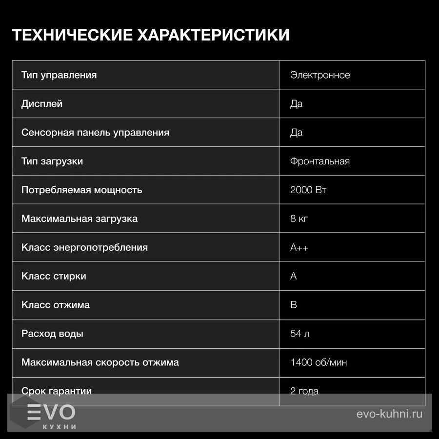Возможна загрузка до 8 кг белья для стирки. Предусмотрен барабан из нержавейки. Относится к классу А+++ по энергопотреблению.