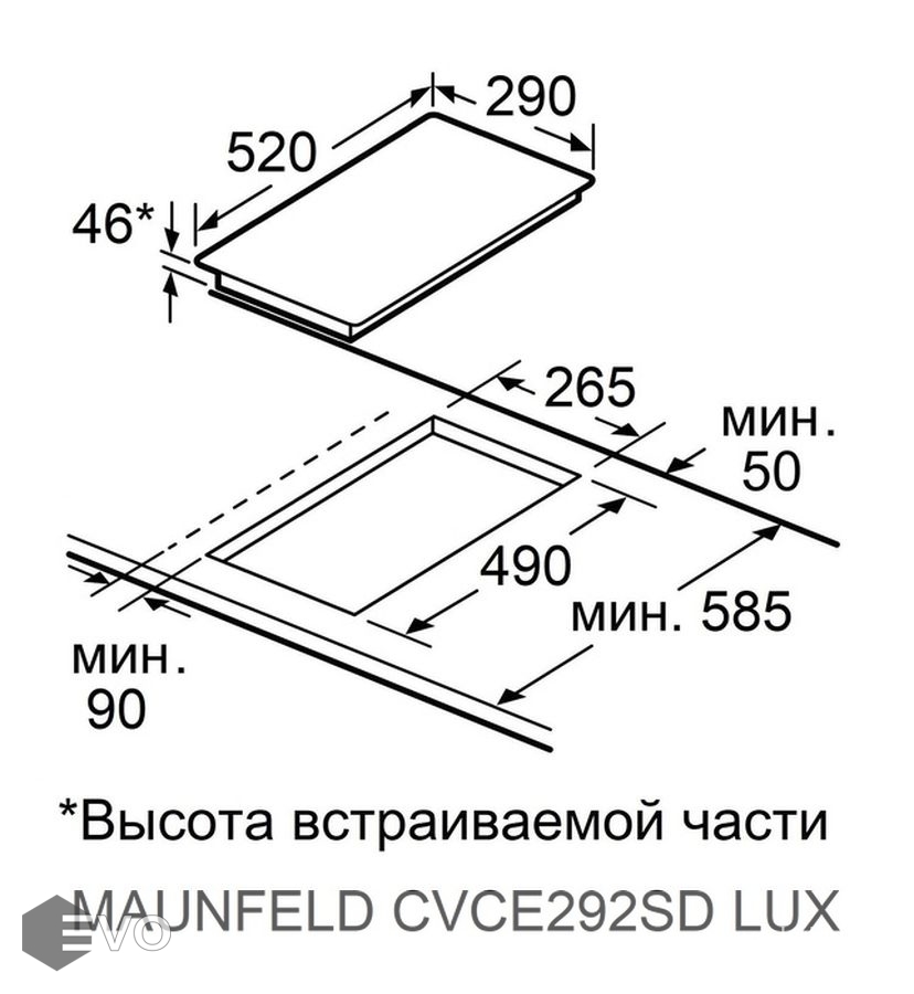Размеры встраивания (ВхШхГ), мм: 52х290х520 мм