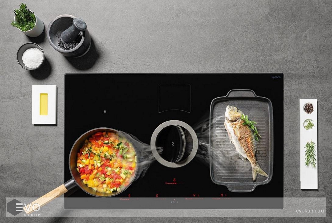 ELICA NIKOLATESLA SWITCH BL/F/83 — индукционная варочная панель в изысканном черном цвете без стыков и выступающих элементов. Зона забора воздуха специально спрятана в кольце из стекла и чугуна.