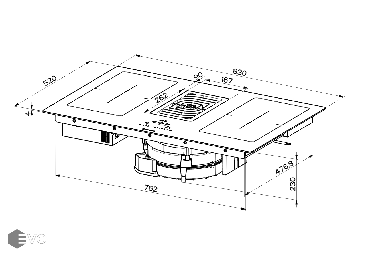 Скорости вентилятора, вплоть до интенсивного режима, адаптируются автоматически в зависимости от уровня мощности поверхности. Есть функция быстрого нагрева Booster, позволяющая временно повысить мощность выбранной конфорки. Управление прибором осуществляется при помощи сенсорного слайдера. Вытяжка работает в двух режимах, отвод и рециркуляция воздуха.