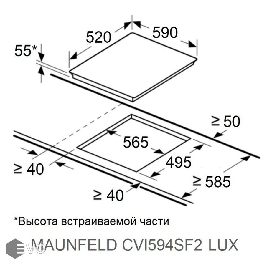 | Размеры встраивания (ВхШхГ), мм: | 59х590х520 мм |