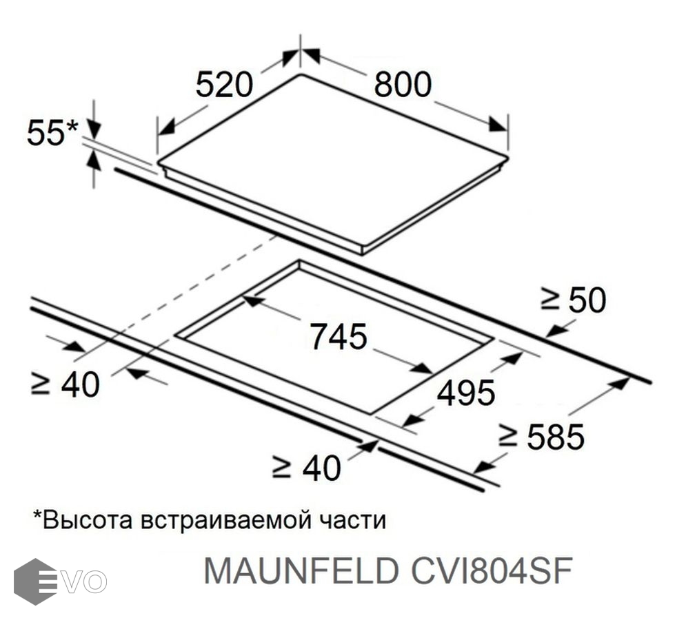 Размеры встраивания (ВхШхГ), мм: | 55х800х520 мм |