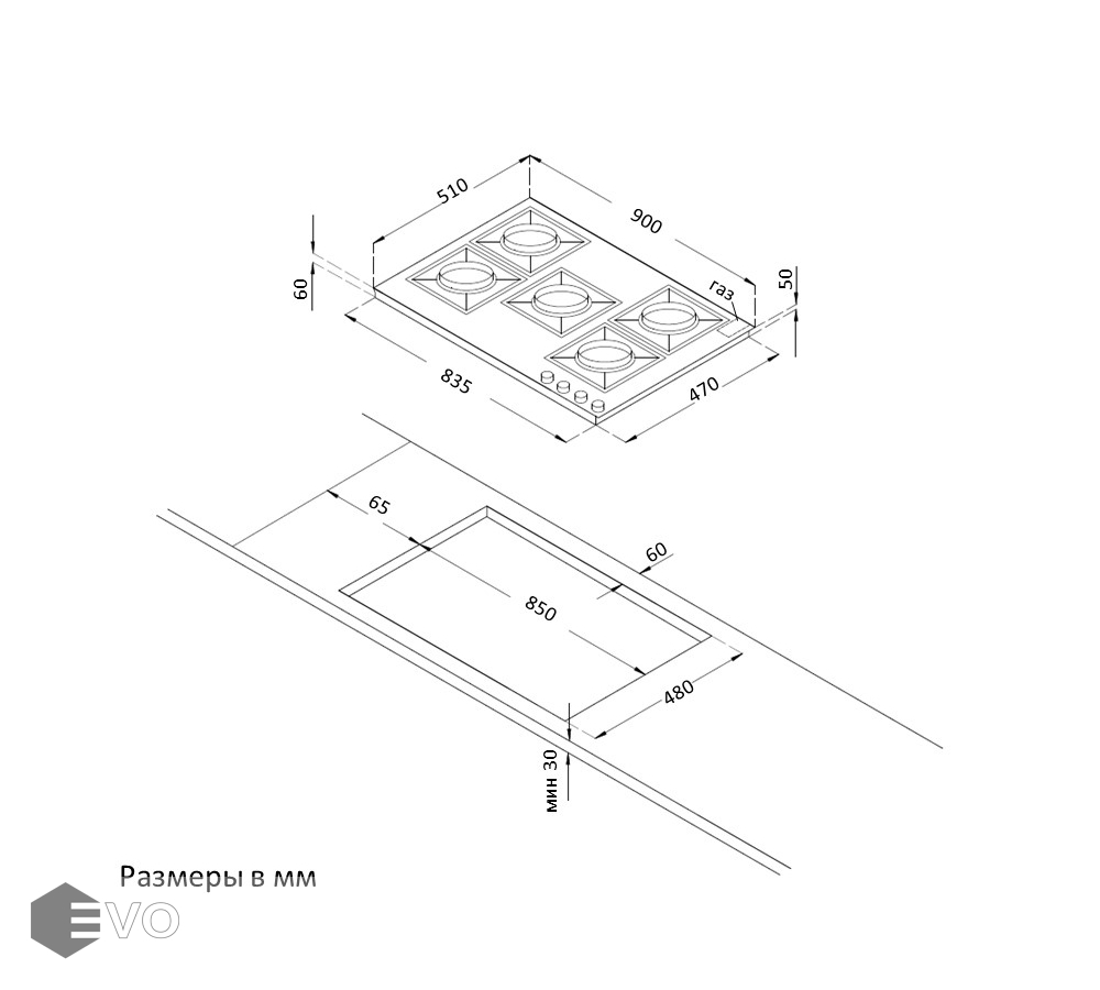 | Размеры встраивания (ВхШхГ), мм: | 30x850х480 |