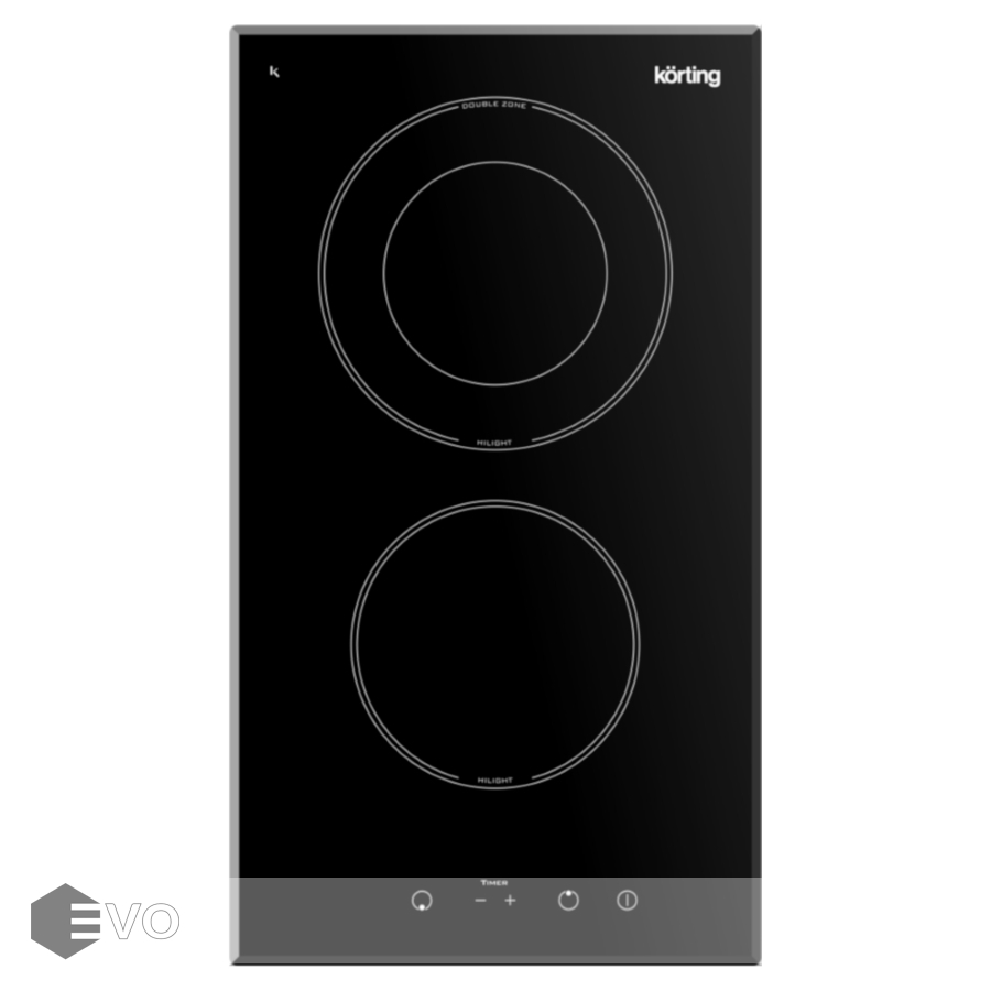 Электрическая HiLight варочная панель Korting HK 32033 B — в этих конфорках в качестве нагревательного элемента применяется уложенная змейкой лента из высокоомного сплава, конфорка достигает установленной рабочей температуры буквально за считанные секунды, позволяет плавно регулировать мощность, излучаемое тепло очень равномерно распределяется по всей рабочей зоне.
