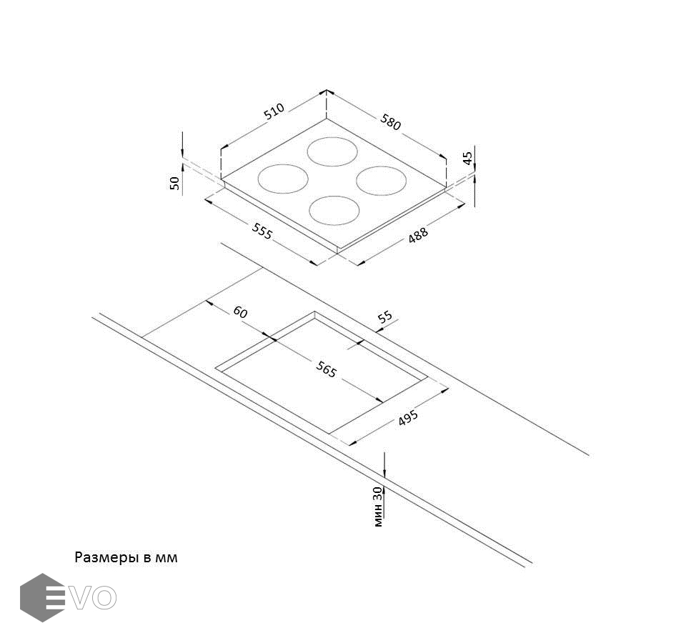 Размеры встраивания (ВхШхГ), мм: 30x565х495