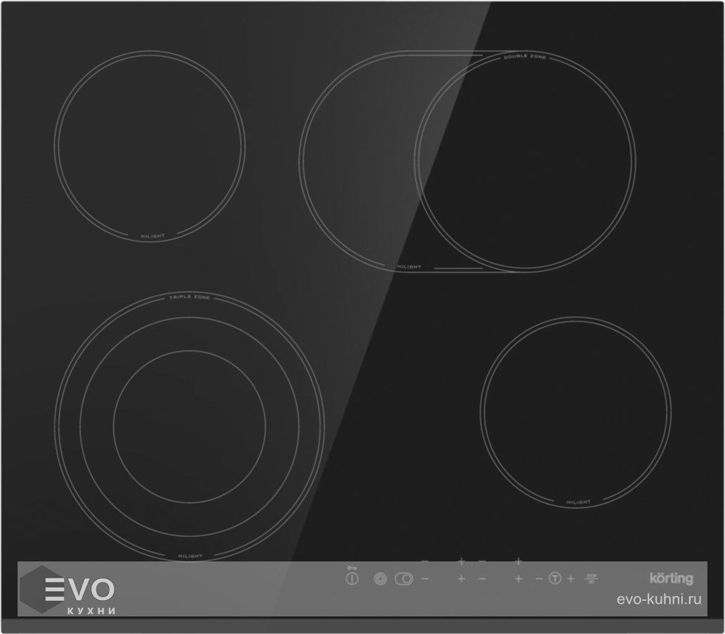 Электрическая HiLight варочная панель Korting HK 63052 B — выполнена из черной стеклокерамики, сенсорная панель управления включается простым нажатием, выбор интенсивности нагрева производится по 9 ступеням.