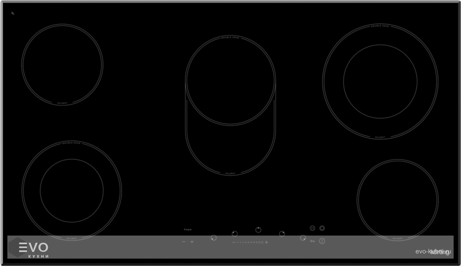 Функции: Таймер конфорок Блокировка панели управления Защитное отключение конфорок Индикатор остаточного тепла Контурная конфорка Овальная зона нагрева