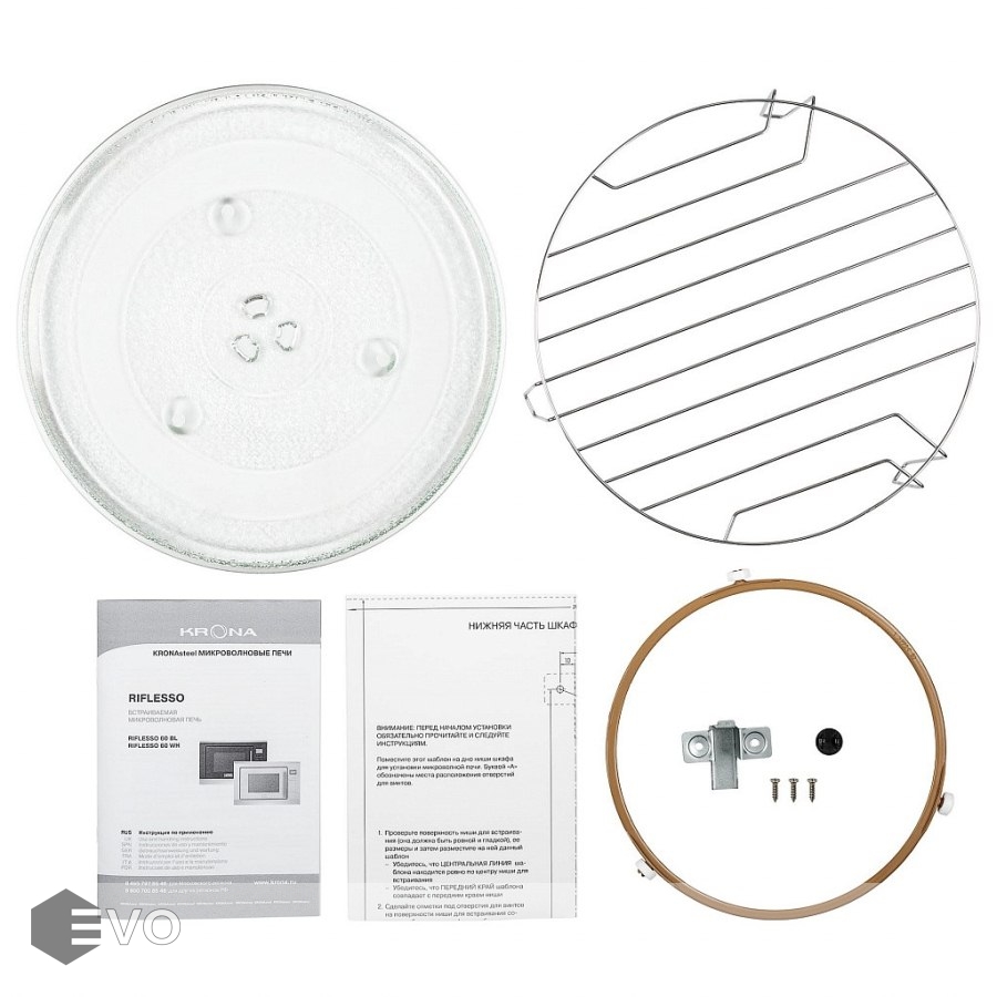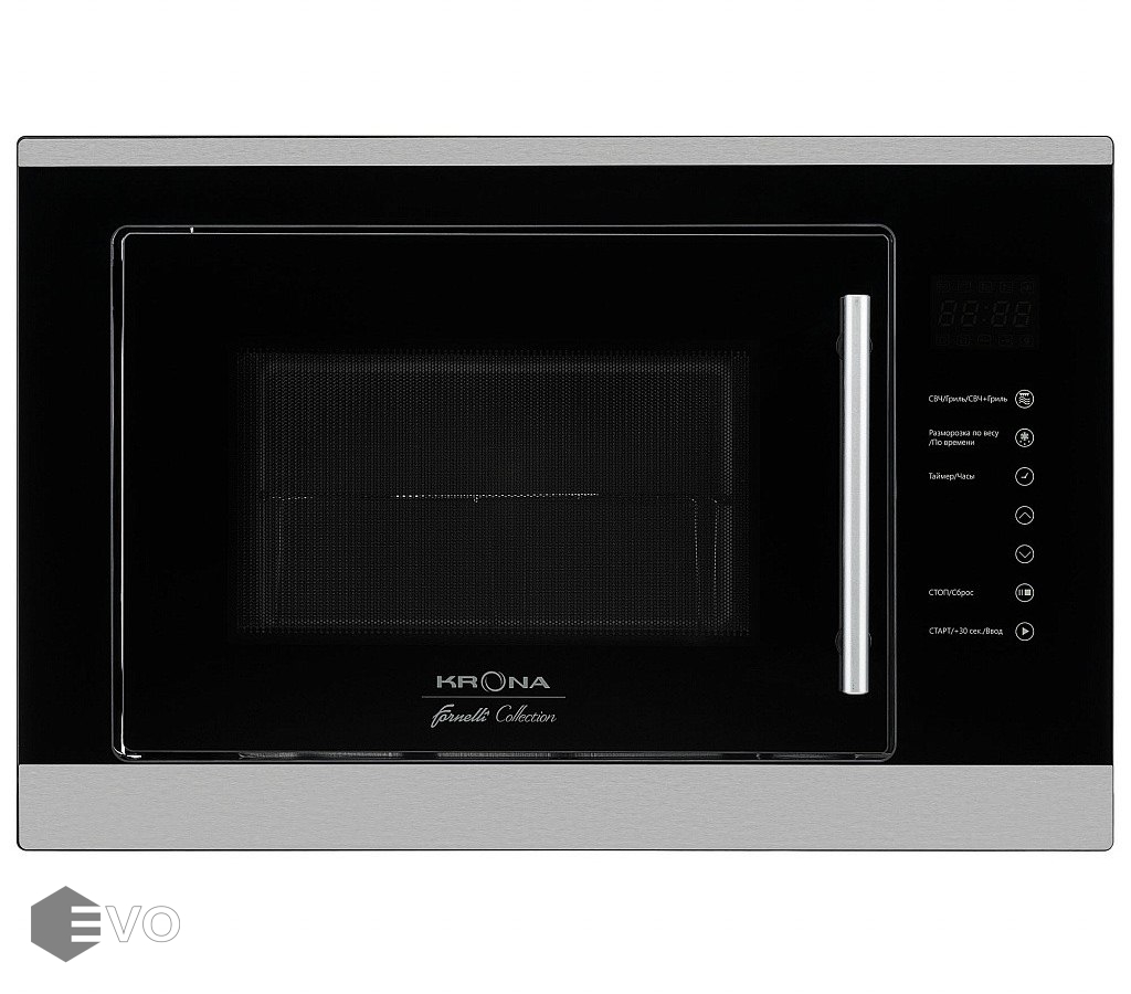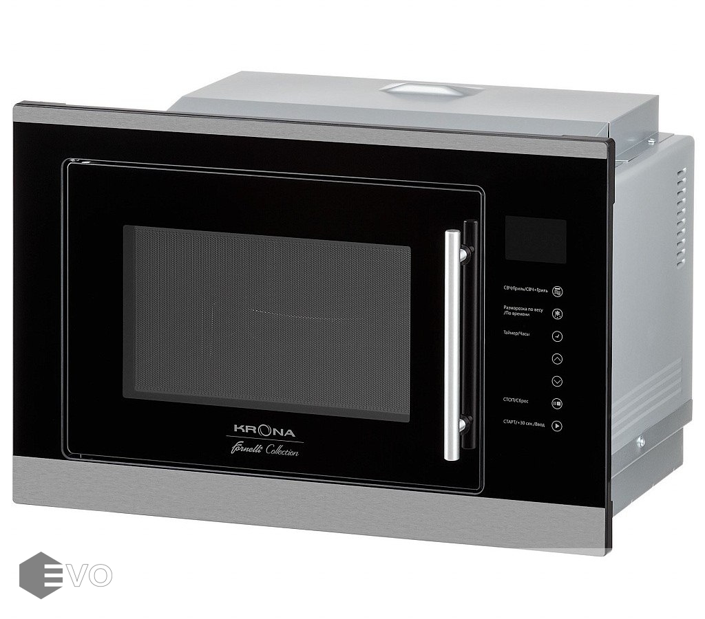 Встраиваемая в шкаф микроволновая печь KRONA RIFLESSO 60 BL – стильная встраиваемая микроволновая печь шириной встраивания 60 см представлена в двух популярных цветовых решениях: черное стекло и белое стекло с элементами из нержавеющей стали. В функционал микроволновой печи входят 8 рецептов автоприготовления, разморозка по весу или по времени, а также электрический гриль. В комплекте поставки модели идут стеклянный поворотный поддон и решетка для гриля.
