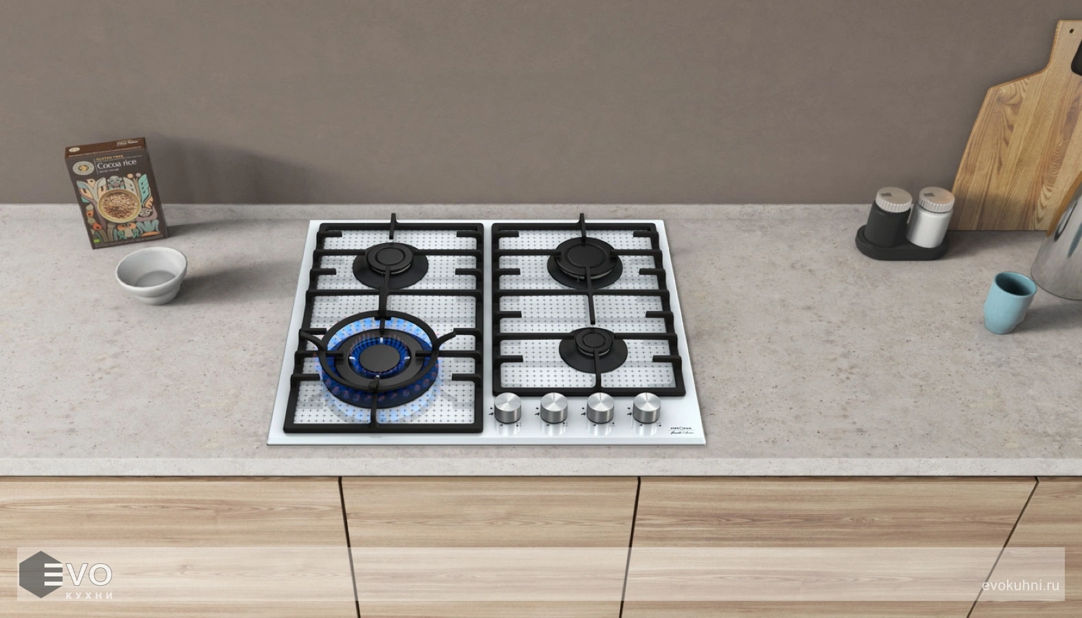 - Цвет поворотных переключателей конфорок: нержавеющая сталь