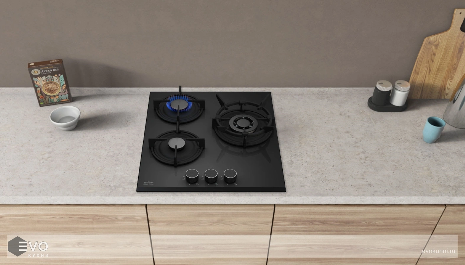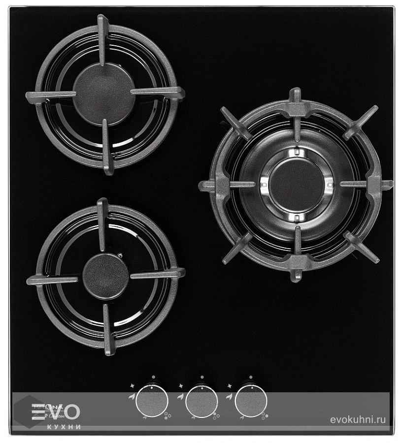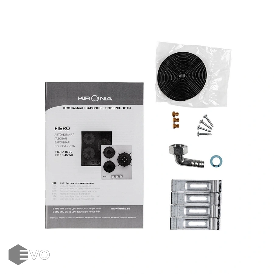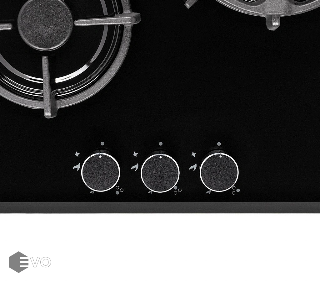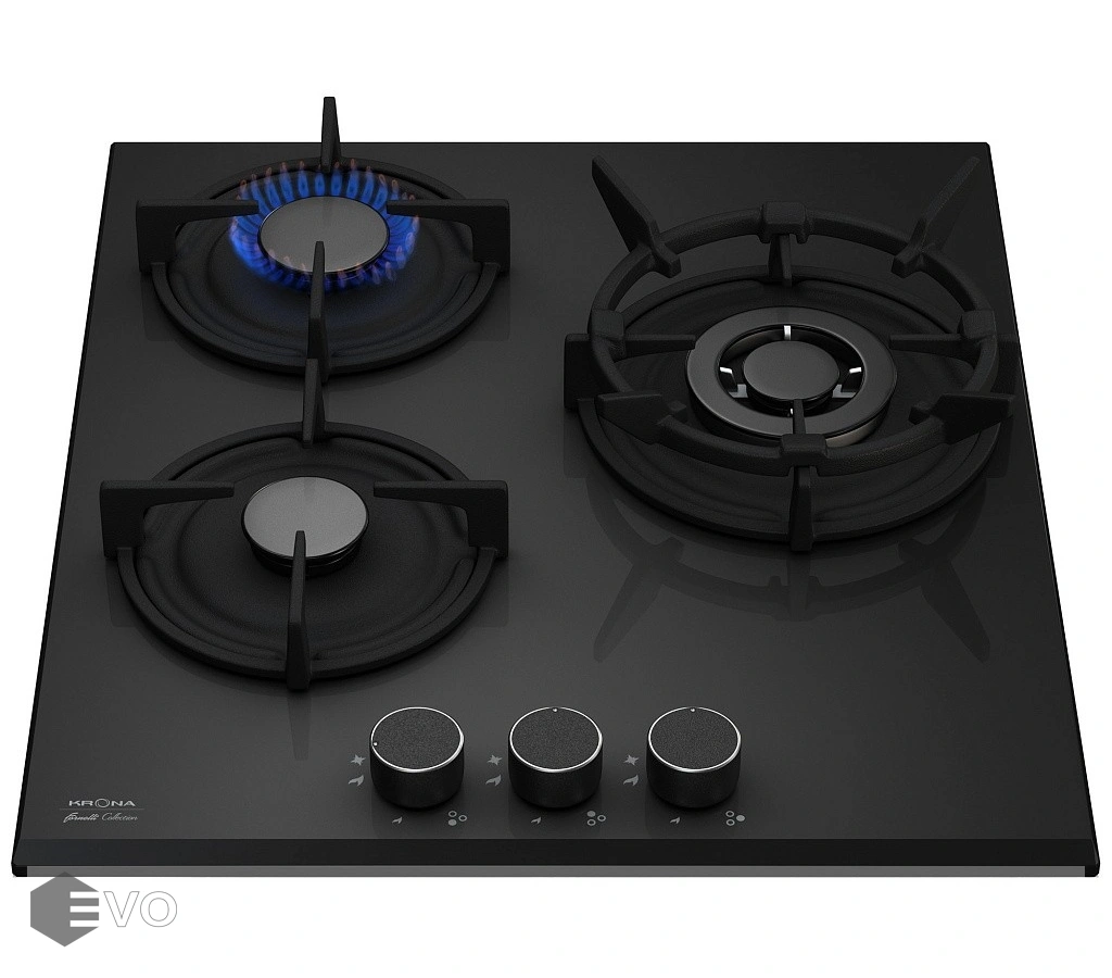 Газовая варочная поверхность KRONA FIERO 45 BL – газовая варочная поверхность выполнена из толстого закаленного стекла толщиной 8 мм, что гарантирует безопасность эксплуатации. В модели предусмотрена функция газ-контроля, автоматический электроподжиг и экспресс-конфорка с тройным пламенем. Приятным дополнением является адаптер для посуды со сферическим дном, который входит в комплект поставки. Поток газа к конфоркам (мощность конфорок) регулируется ручками управления газовыми конфорками, которые, в свою очередь, управляют кранами.