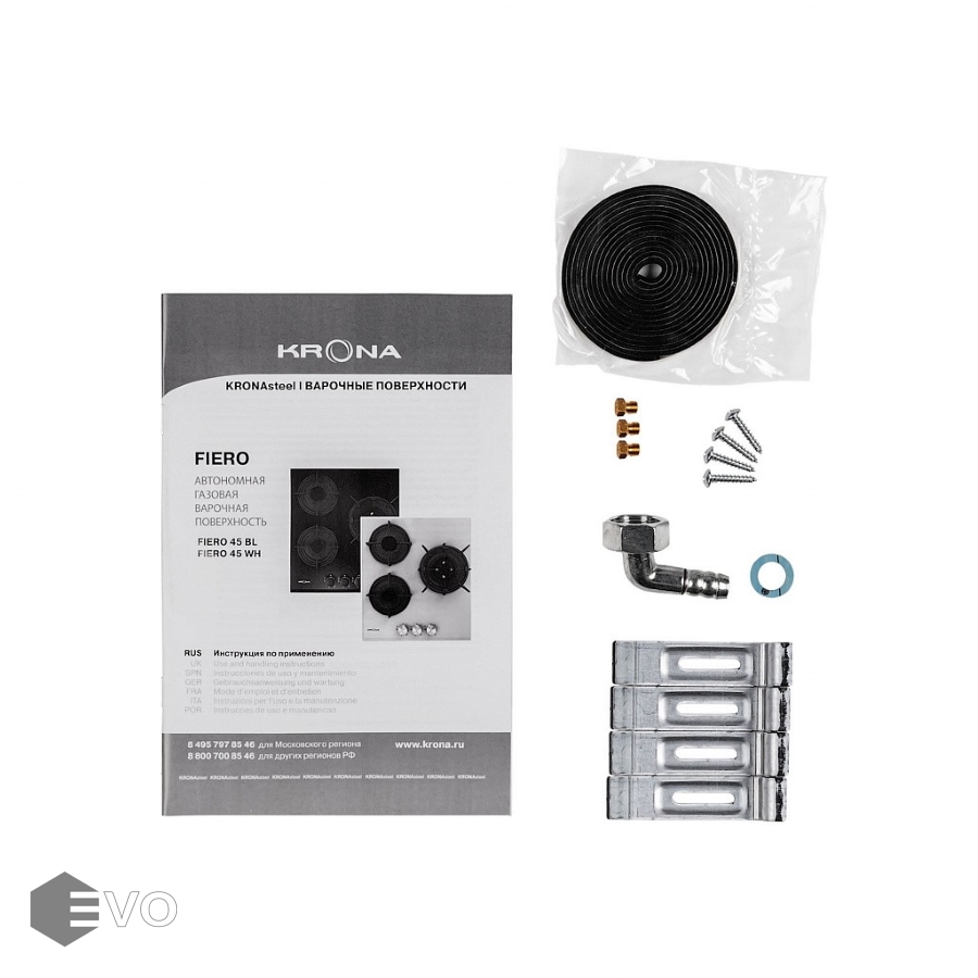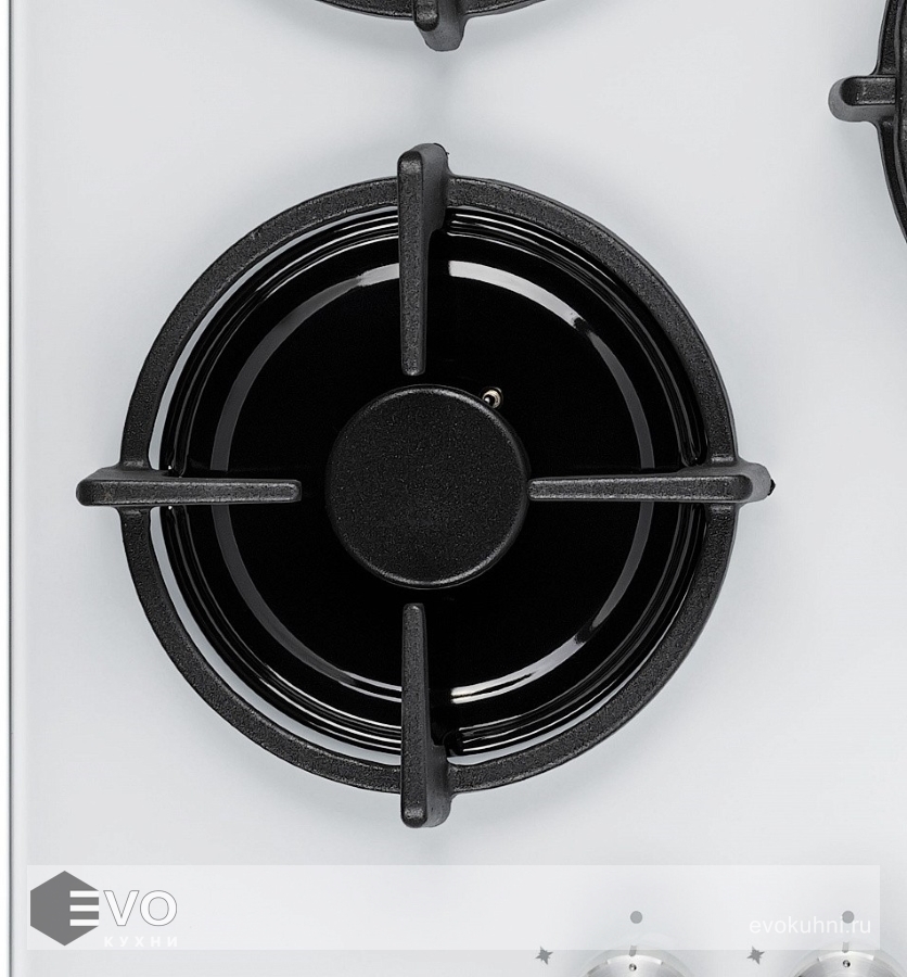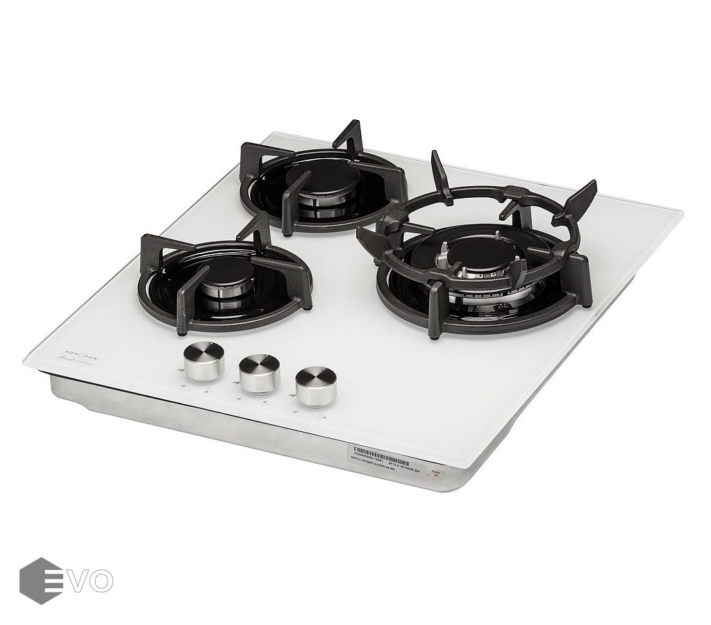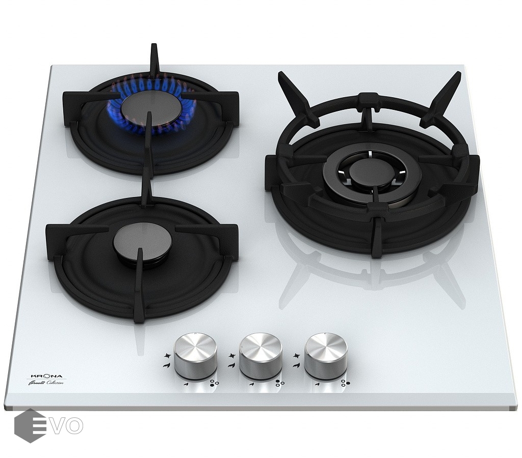Газовая варочная поверхность KRONA FIERO 45 WH – газовая варочная поверхность выполнена из толстого закаленного стекла толщиной 8 мм, что гарантирует безопасность эксплуатации. В модели предусмотрена функция газ-контроля, автоматический электроподжиг и экспресс-конфорка с тройным пламенем. Приятным дополнением является адаптер для посуды со сферическим дном, который входит в комплект поставки. Поток газа к конфоркам (мощность конфорок) регулируется ручками управления газовыми конфорками, которые, в свою очередь, управляют кранами.