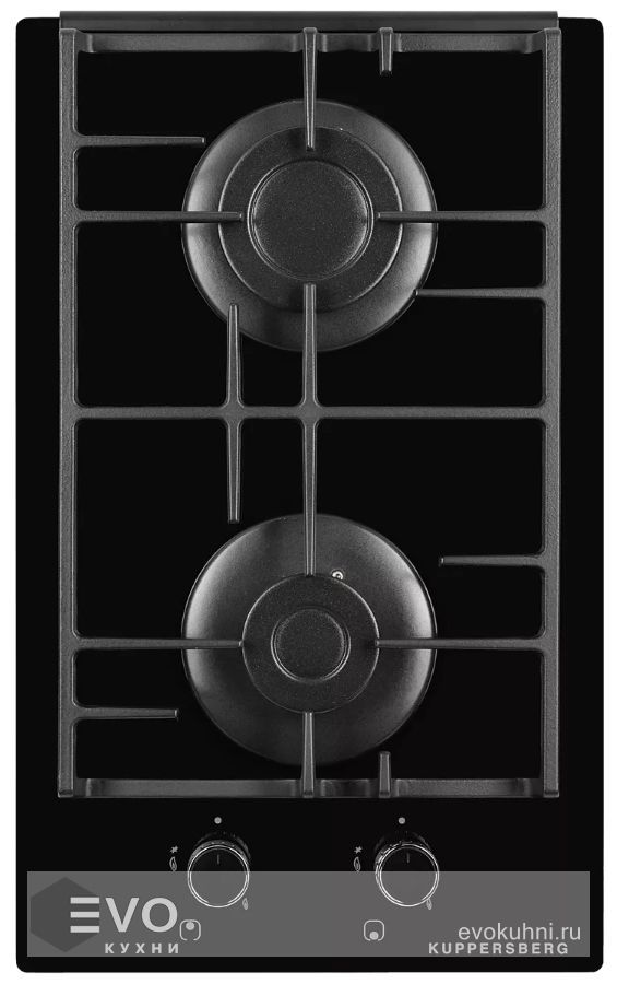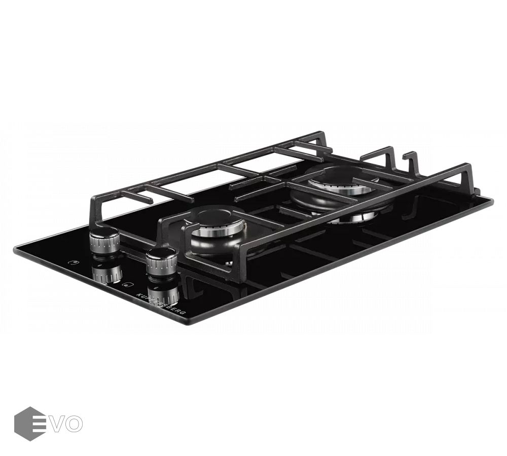 Газовая варочная поверхность, закаленное стекло, ширина 30 см, 2 газовые конфорки, 1 конфорка повышенной мощности, автоподжиг, газ-контроль, чугунные решетки, цвет черный.