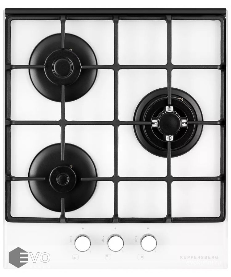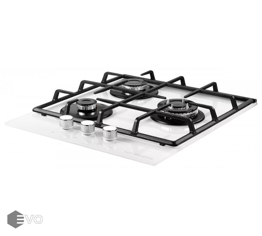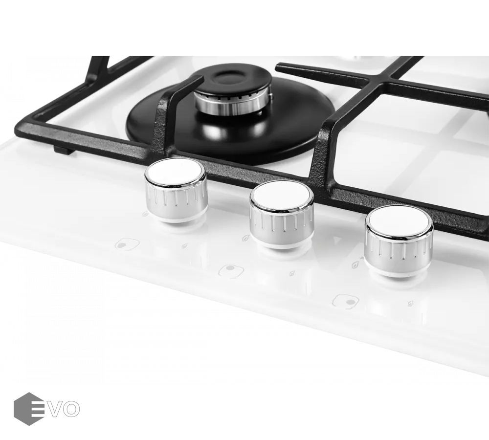 Газовая варочная поверхность, закаленное стекло, ширина 45 см,  3 газовые конфорки, 1 конфорка WOK, автоподжиг, газ-контроль, чугунные решетки, цвет белый.
