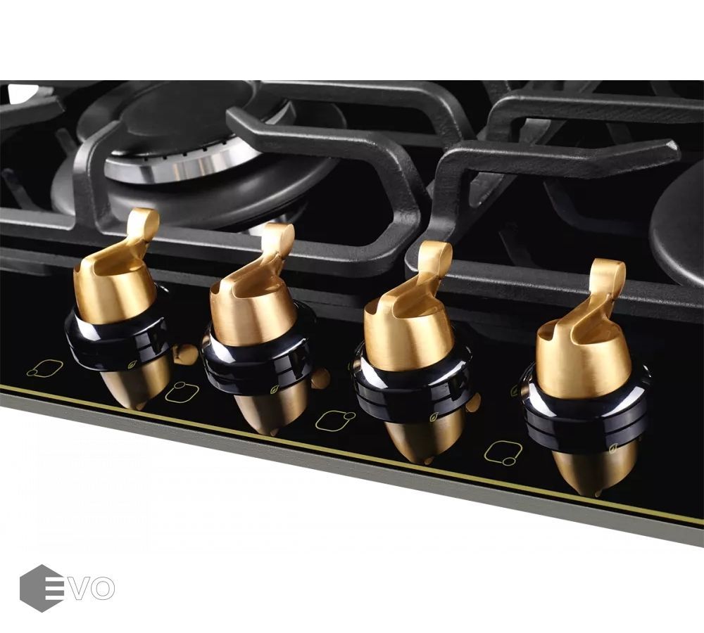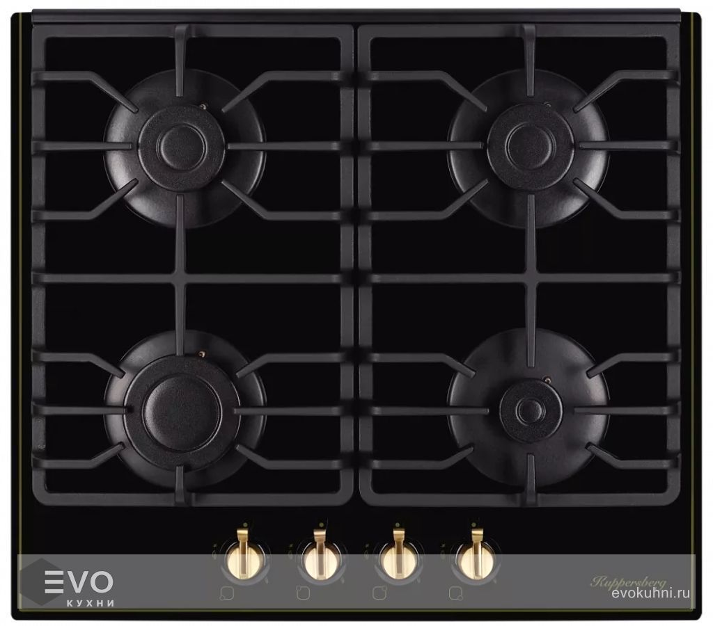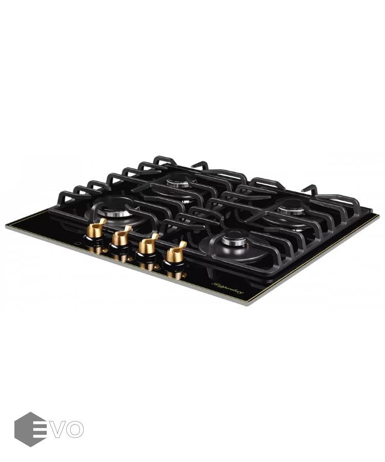 Газовая варочная поверхность, закаленное стекло, ширина 60 см, 4 газовые конфорки, автоподжиг, газ-контроль, чугунные решетки, цвет чёрный /поворотные переключатели цвета бронзы.