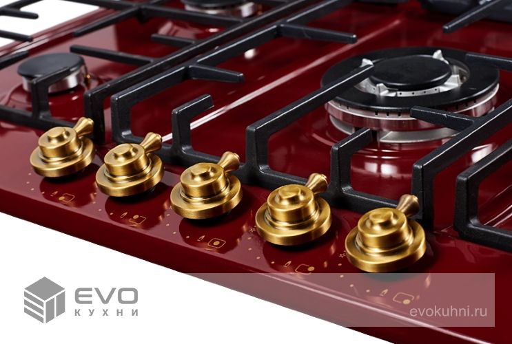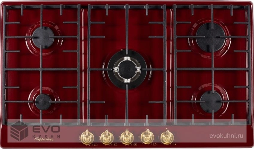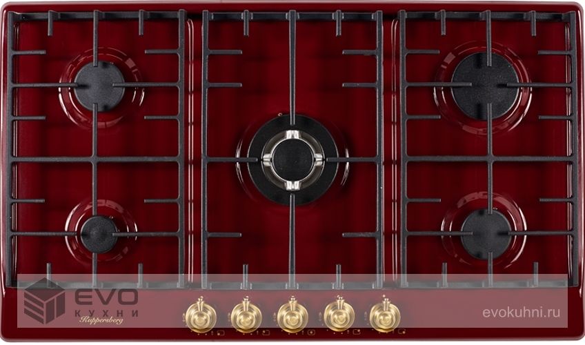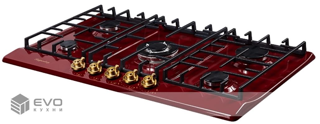 Газовая варочная поверхность металл, ширина 90 см, 5 газовых конфорок, WOK конфорка повышенной мощности, автоподжиг, газ-контроль, чугунные решетки, цвет бордовый/ручки цвета бронза. Варочные поверхности покрытые эмалью имеют глубину цвета, а также приятные и гладкие на ощупь. Современные технологии эмали позволяют создать материал стойкий к нагреву и устойчивый к износу и по этим причинам эмалированные варочные поверхности, не только красивы, но и практичны в применении и уходе.