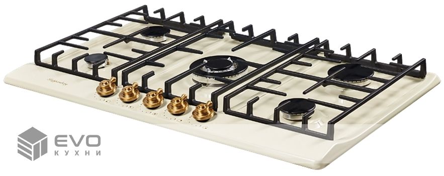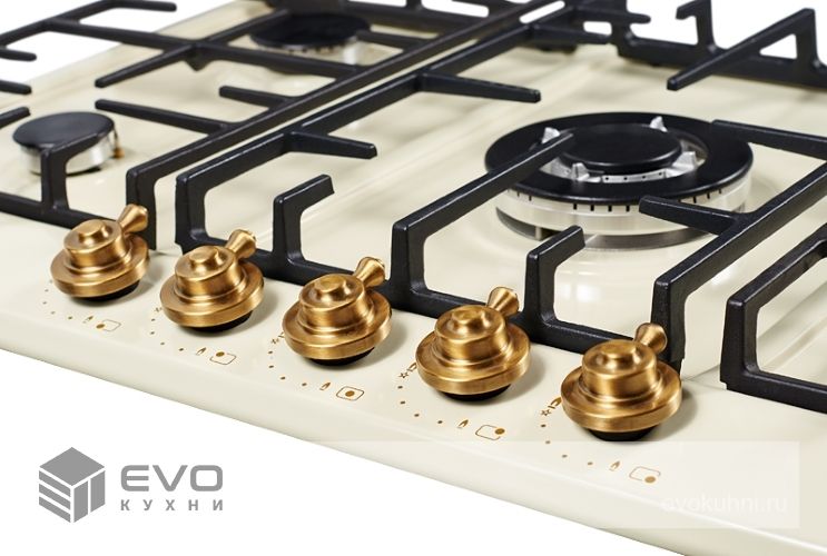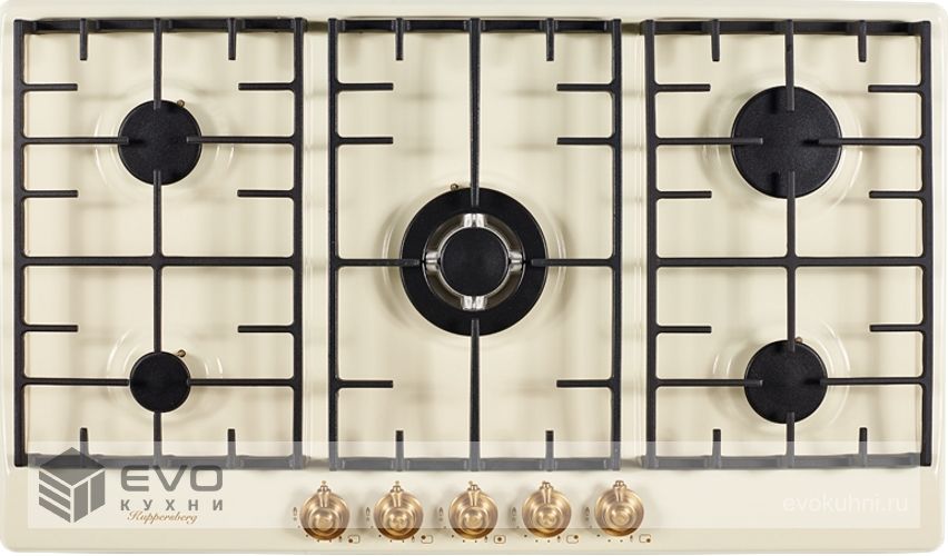 Газовая варочная поверхность металл, ширина 90 см, 5 газовых конфорок, WOK конфорка повышенной мощности, автоподжиг, газ-контроль, чугунные решетки, цвет бежевый/ручки цвета бронза. Варочные поверхности покрытые эмалью имеют глубину цвета, а также приятные и гладкие на ощупь. Современные технологии эмали позволяют создать материал стойкий к нагреву и устойчивый к износу и по этим причинам эмалированные варочные поверхности, не только красивы, но и практичны в применении и уходе.