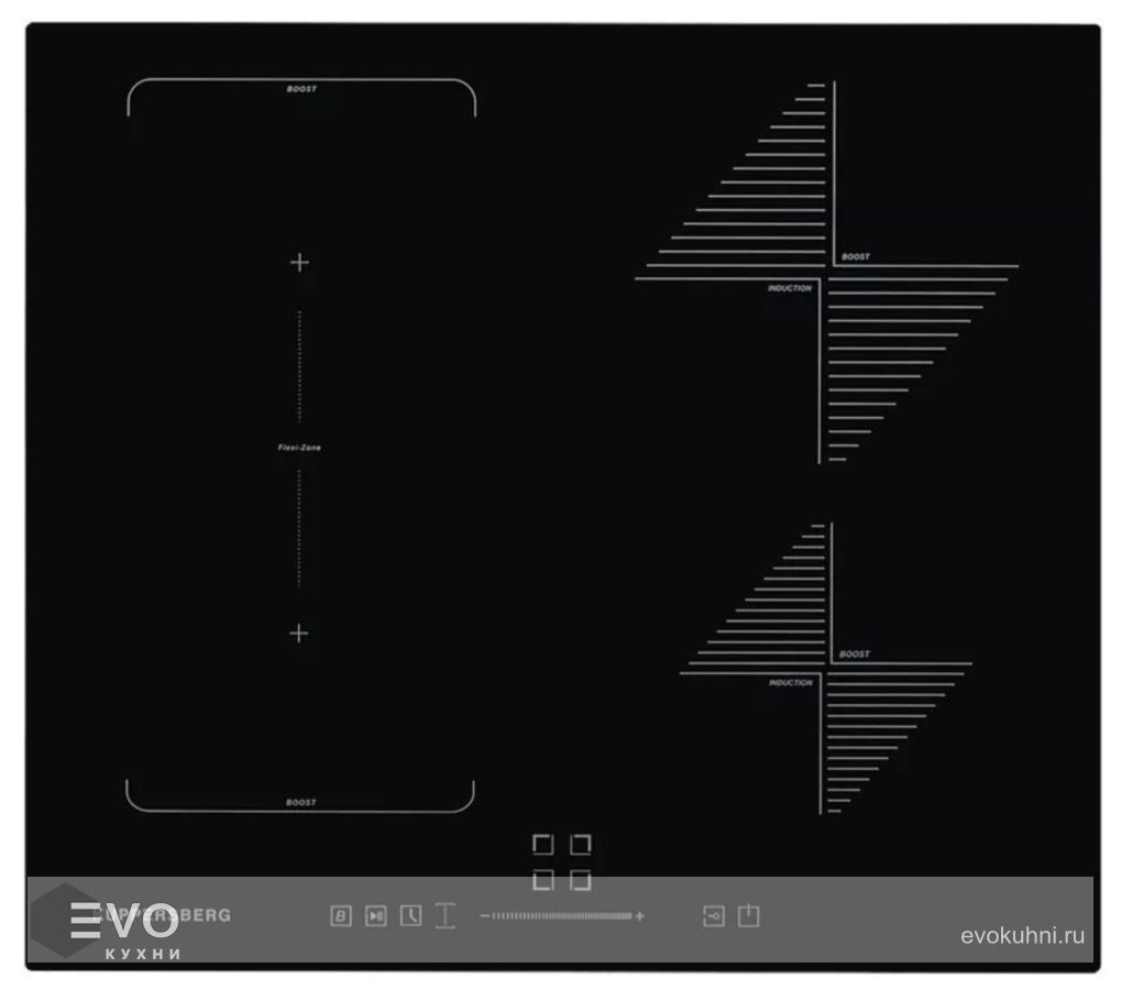 Индукционная варочная поверхность стеклокерамическая, ширина 60 см, 2 зоны 1,5 кВт (BOOSTER 2 кВт), 2 зоны 2 кВт (BOOSTER 2,6 кВт), 1 зона Flexi/Bridge 400*220 mm 3 кВт (BOOSTER 3,6 кВт), электронное сенсорное управление + слайдер, 5 цифровых дисплеев, 9 уровней мощности, автоматическое отключение, автоматика закипания, защита от детей/блокировка панели управления, индикаторы остаточного тепла, Таймер, Stop & Go, цвет чёрный/прямой край.