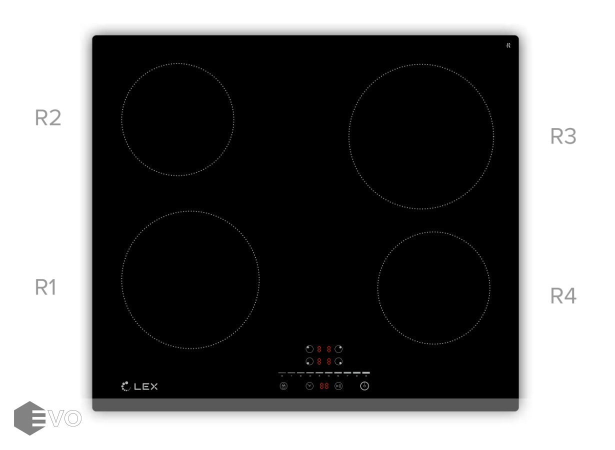 - Одноконтурная конфорка (R2, R4): 2 х 1800 Вт (Ø 190 мм)
