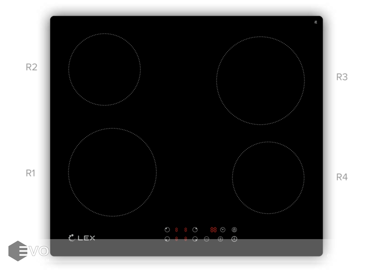 - Двухконтурная конфорка (R1,R3): 2 х 1800 Вт (Ø 190 мм)