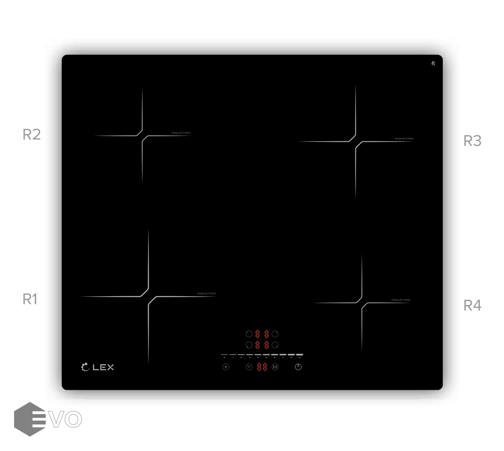 - Индукционная конфорка (R2,R4): 2 х 1400 Вт. (Ø 160 мм)