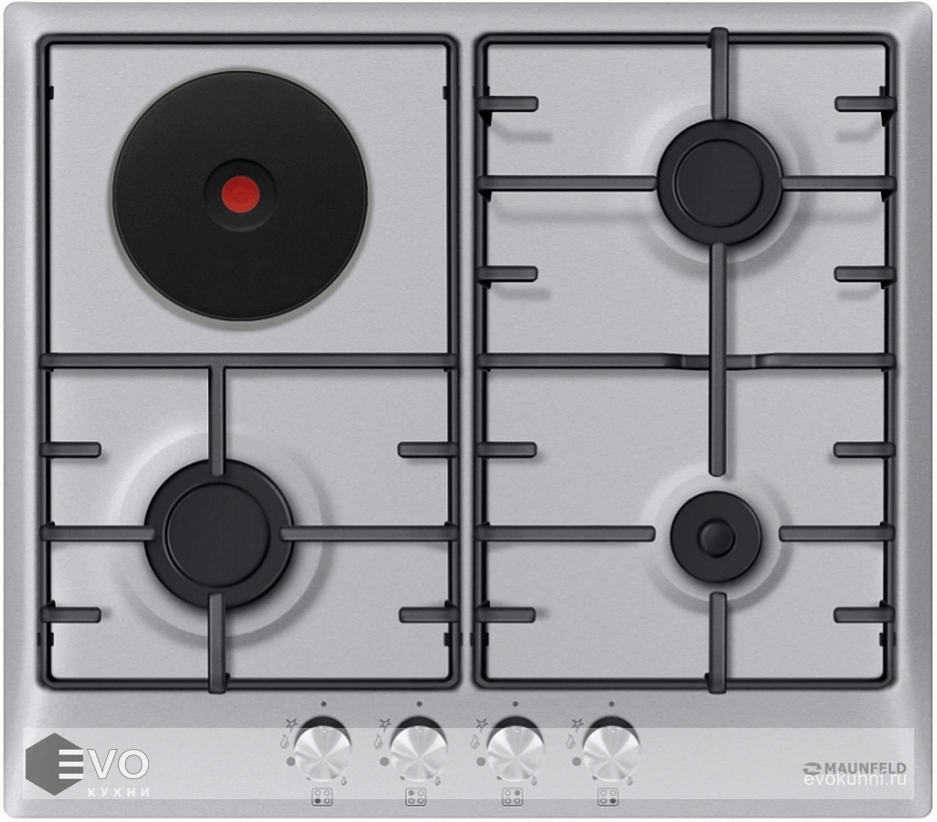 Комбинированная варочная панель MAUNFELD EEHS.64.3CS/KG – встраиваемая комбинированная варочная панель шириной 60 см - уникальное сочетание газовой и электрической плит. Панель выполнена из нержавеющей стали, устойчивого к царапинам и постоянным перепадам температур. Может работать как от магистрального газа, так и от газа в баллоне, для этого достаточно поставить специальные жиклеры, имеющиеся в комплекте.