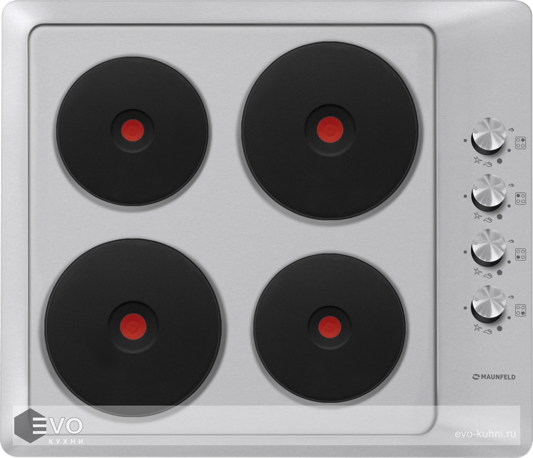 Электрическая варочная панель MAUNFELD EEHS.64.4S – встраиваемая варочная панель шириной 60 см, выполненная из нержавеющей стали. Она не только встраивается в столешницу, но и может использоваться как отдельно стоящая плита. Для этого предусмотрены 4 прорезиненные ножки-опоры. Варочная поверхность имеет бортик по всему периметру плиты и вокруг каждой конфорки. Благодаря этому, выкипевшая жидкость не попадает ни на горячую конфорку, ни на столешницу.