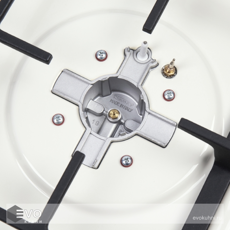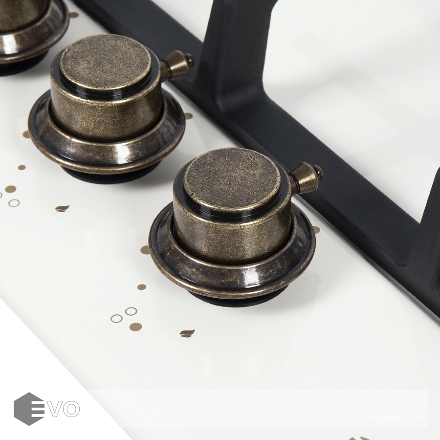 Панель в ретро-стиле выполнена из нержавеющей стали, покрытой термостойкой прочной эмалью бежевого цвета. В данной модели установлены итальянские горелки «Sabaf». Две стандартные конфорки мощностью 1000 Вт, 1700 Вт и одна мощная WOK-конфорка с двойным пламенем мощностью 3000 Вт. Управление подачей газа и поджигом конфорок происходит с помощью поворотных регуляторов - цельнометаллических ручек цвета патинированной бронзы. Для простоты использования около каждой ручки нанесены информационные изображения: используемая конфорка, подача газа выключена, электроподжиг, максимальное пламя и минимальное пламя.