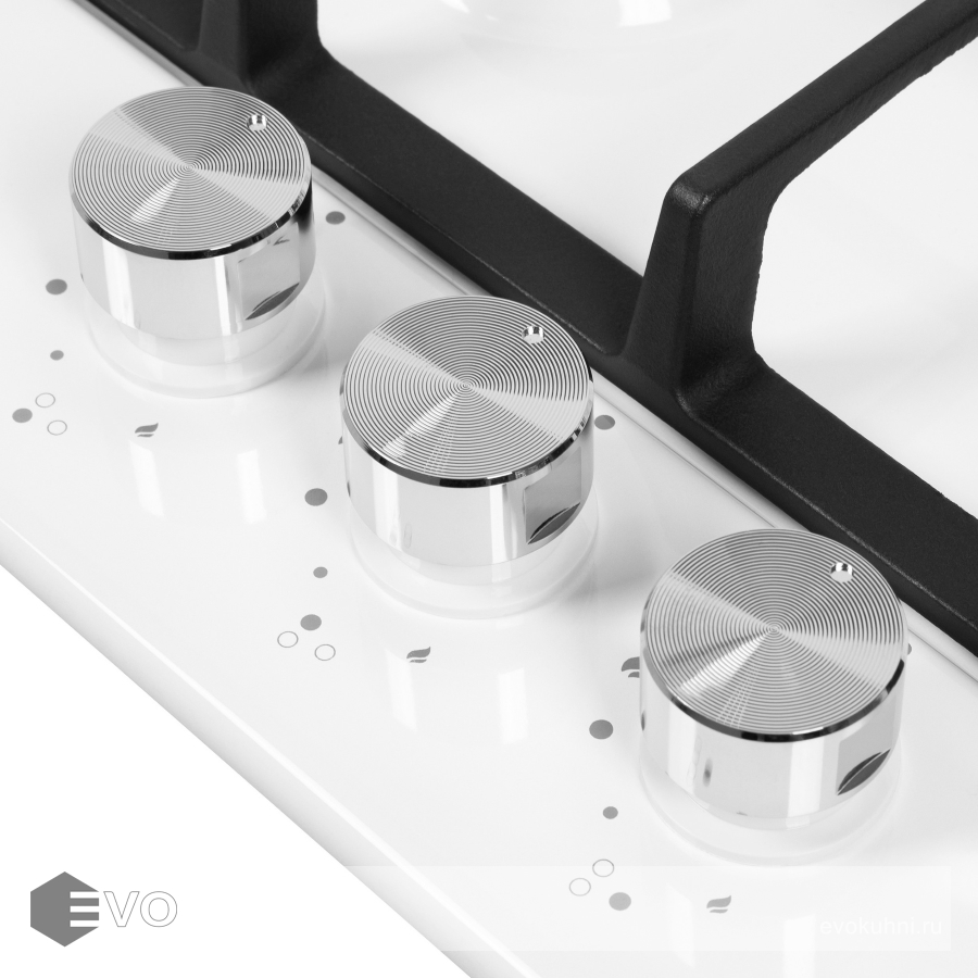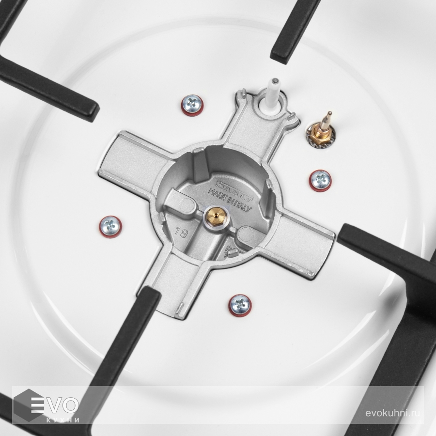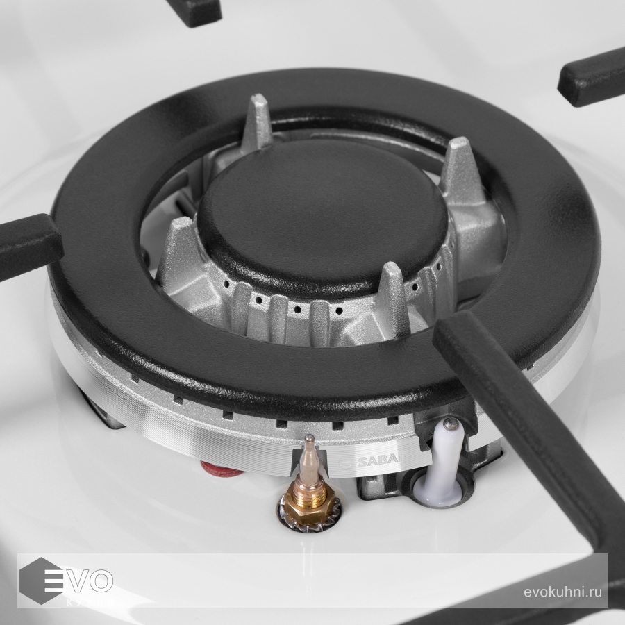 Панель выполнена из высококачественной нержавеющей стали, покрытой прочной эмалью. В данной модели установлены итальянские горелки SABAF. Две стандартные конфорки мощностью 1000 Вт, 1700 Вт и одна мощная WOK-конфорка с двойным пламенем мощностью 3000 Вт. Регулирование подачи газа и электроподжиг конфорок происходит с помощью поворотных ручек из высокопрочного термостойкого пластика. Для простоты использования около каждой ручки нанесены информационные изображения: используемая конфорка, подача газа выключена, электроподжиг, максимальное пламя и минимальное пламя.