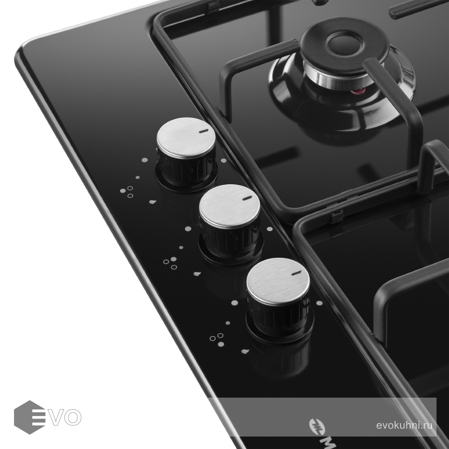 Управление подачи газа и электроподжиг конфорок происходит с помощью поворотных регуляторов - ручек из высокопрочного термостойкого пластика. Для простоты использования около каждой ручки нанесены информационные изображения: используемая конфорка, подача газа выключена, электроподжиг, максимальное пламя и минимальное пламя.