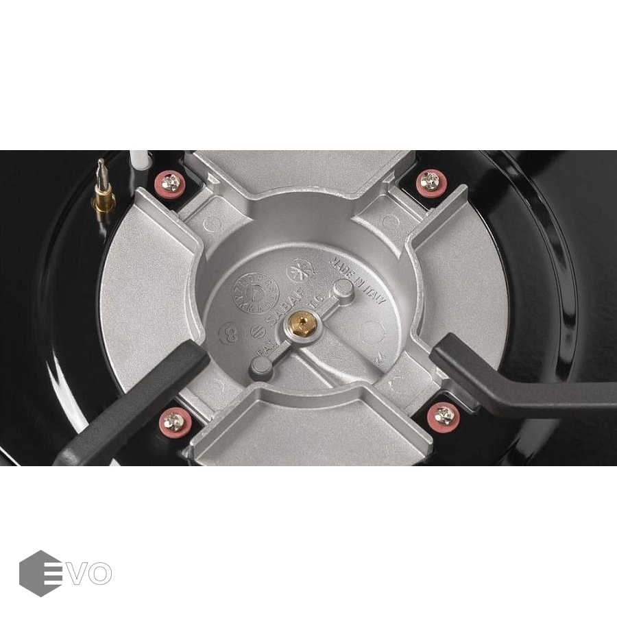 Панель выполнена из металла, покрытого термостойкой прочной эмалью. В данной модели установлены высококачественные итальянские горелки «Sabaf». Три стандартные конфорки мощностью 1000 Вт, 1700 Вт, 1700 Вт и одна сверхмощная WOK-конфорка с двойным пламенем мощностью 3800 Вт. Конфорки спроектированы таким образом, что огонь не перегревает ни чугунные решетки, ни ручки управления. Управление подачей газа и поджигом конфорок происходит с помощью поворотных регуляторов - полнотелых цельнометаллических ручек черного цвета. Для простоты использования около каждой ручки нанесены информационные изображения: используемая конфорка, подача газа выключена, электроподжиг, максимальное пламя и минимальное пламя.