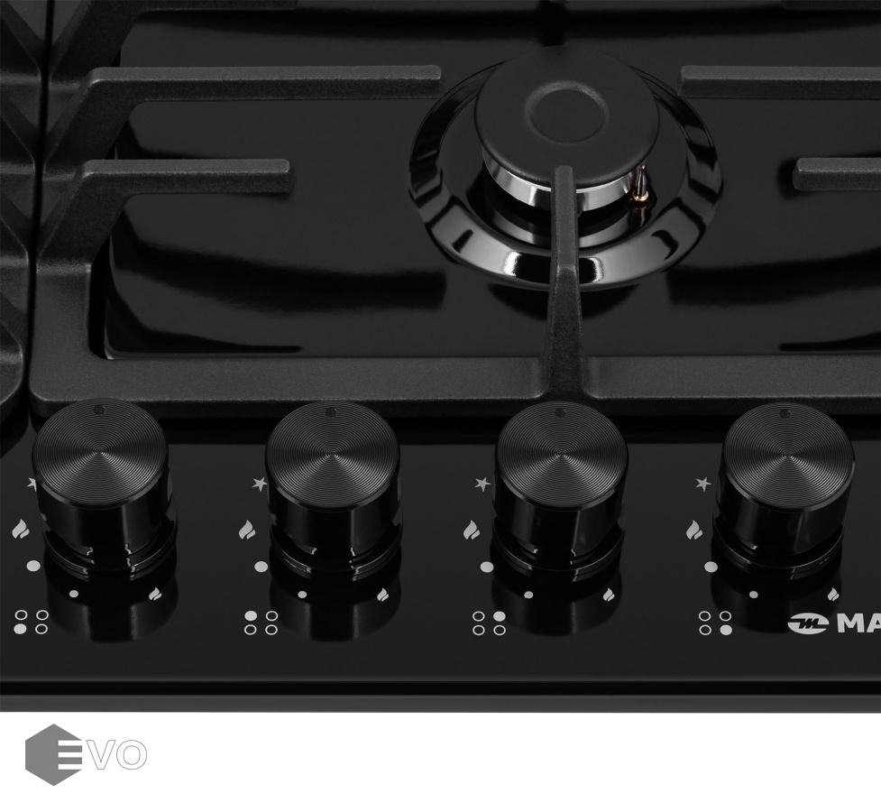 Изменение мощности нагрева и электроподжиг конфорок производится с помощью поворотных регуляторов - полнотелых цельнометаллических ручек, выполненных в черном цвете. Для простоты использования около каждой ручки нанесены информационные изображения: используемая конфорка, подача газа выключена, электроподжиг, максимальное пламя и минимальное пламя.