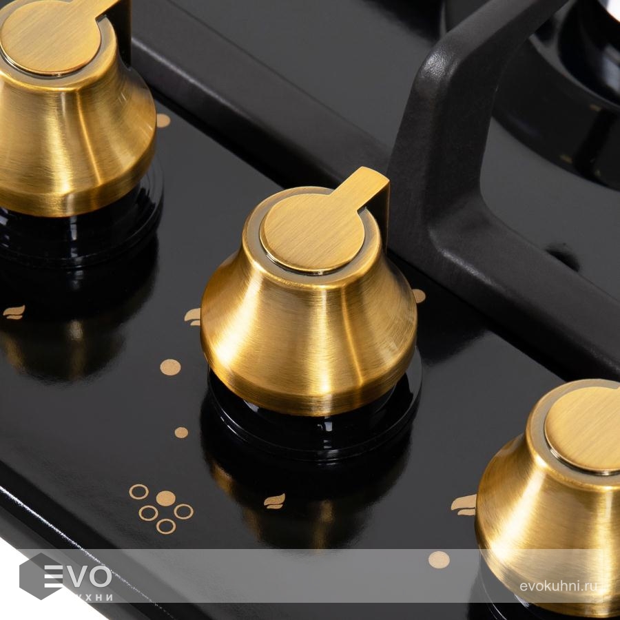 Управление подачей газа и поджигом конфорок происходит с помощью поворотных регуляторов - ярких цельнометаллических ручек цвета бронзы, выполненных в ретро-стиле. Для простоты использования около каждой ручки нанесены информационные изображения: используемая конфорка, подача газа выключена, электроподжиг, максимальное пламя и минимальное пламя.