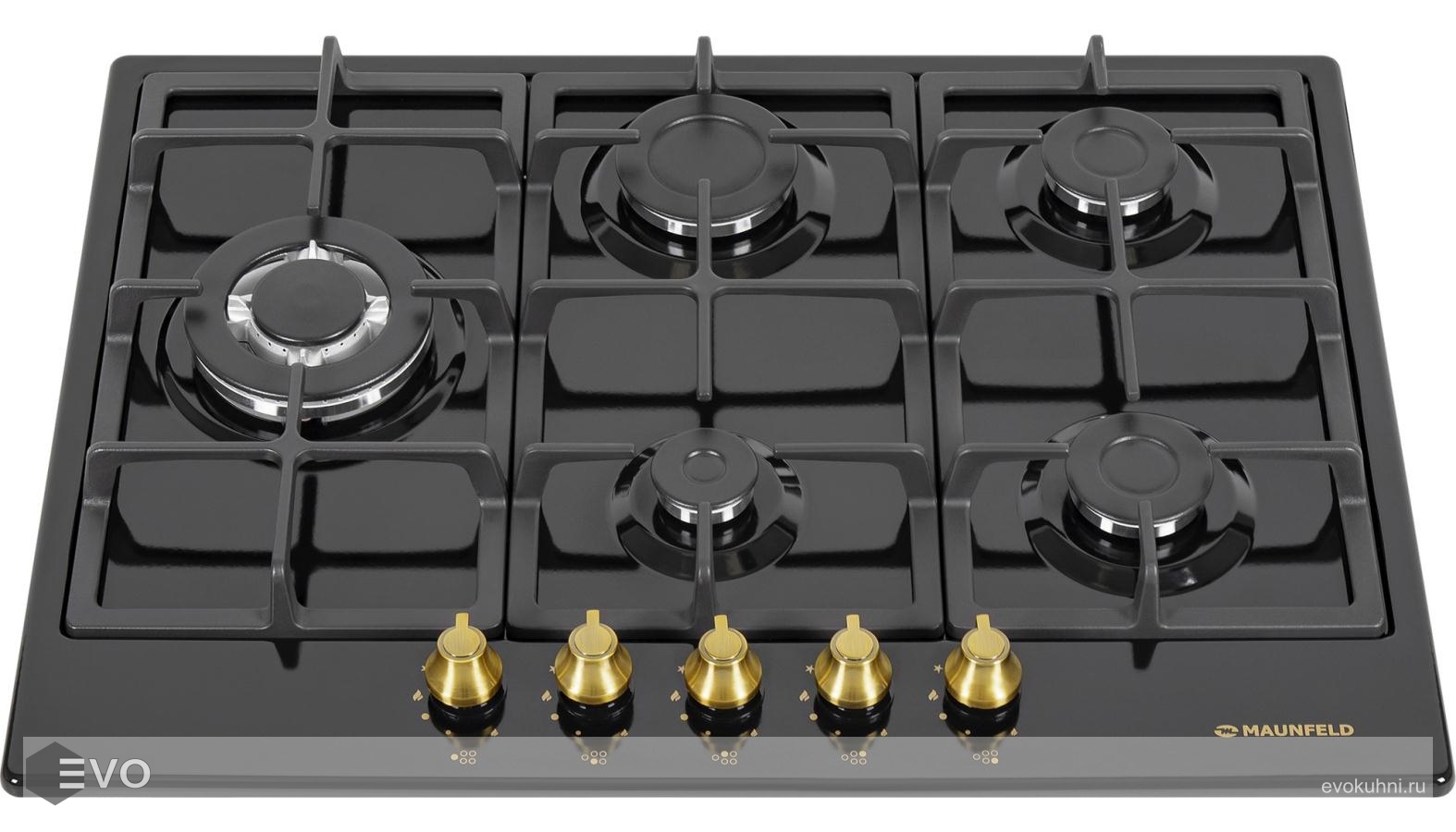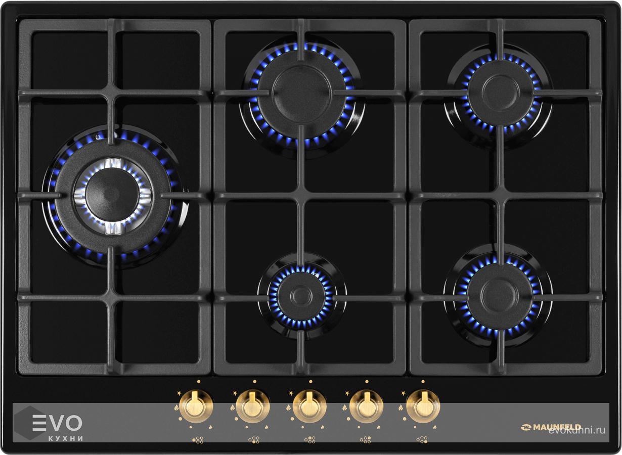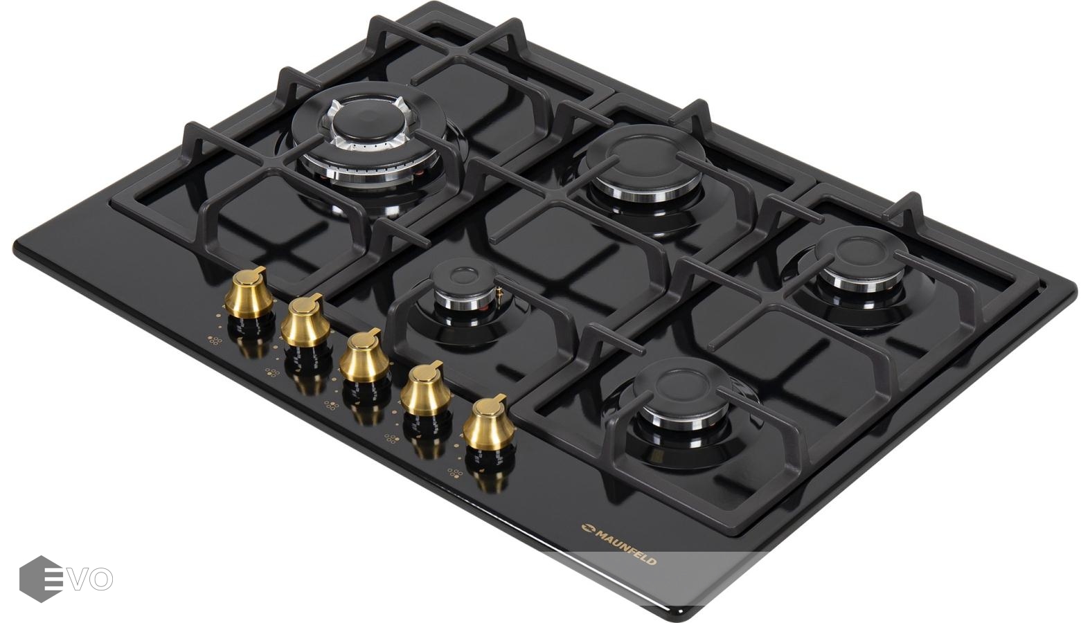 Газовая варочная поверхность MAUNFELD EGHE.75.33CB.R/G – встраиваемая газовая варочная панель шириной 70 см, работает от магистрального газа и газа в баллоне (тип G30), для этого достаточно поставить специальные жиклеры, которые есть в комплекте. Панель выполнена из нержавеющей стали, покрытой термостойкой прочной эмалью черного цвета. В данной модели установлены высококачественные итальянские горелки «Sabaf». Четыре стандартные конфорки разного диаметра мощностью 1000 Вт, 1700 Вт, 1700 Вт, 2600 Вт и 1 сверхмощная WOK-конфорка с двойным пламенем мощностью 3800 Вт, расположенная на левой части панели.