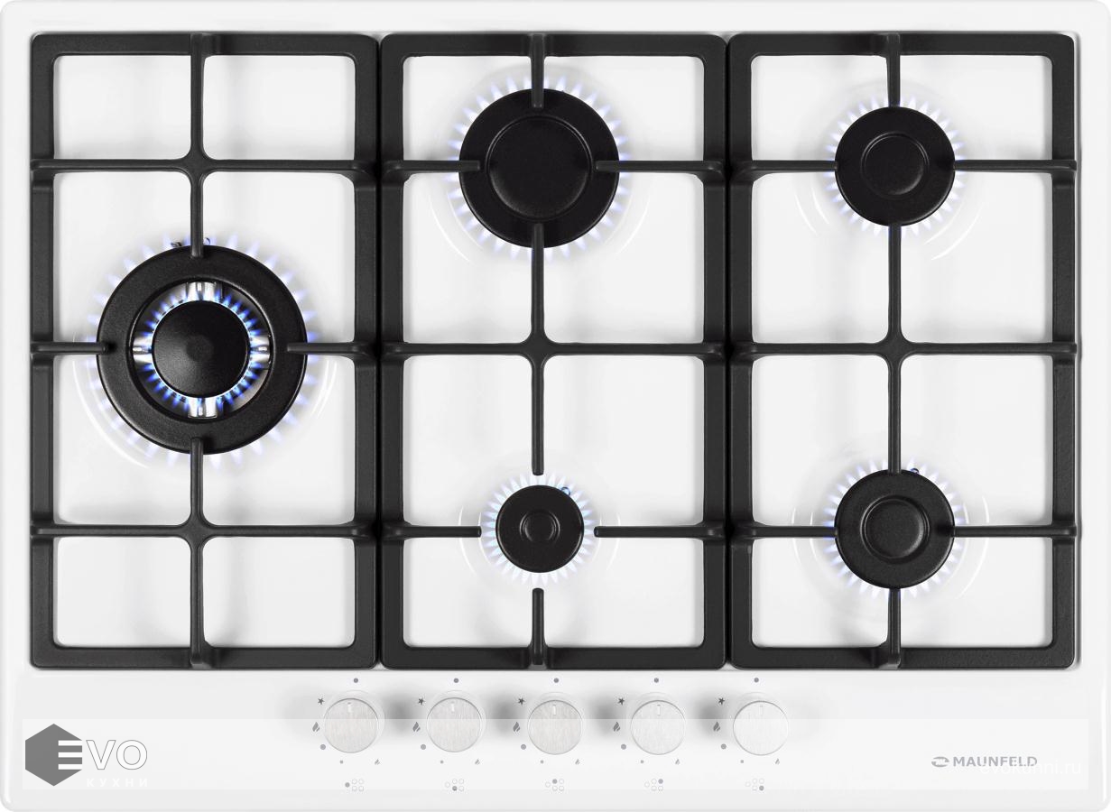Газовая варочная поверхность MAUNFELD EGHE.75.33CW/G – встраиваемая газовая варочная панель шириной 70 см., работает от магистрального газа и газа в баллоне (тип G30), для этого достаточно поставить специальные жиклеры, которые есть в комплекте. Панель выполнена из нержавеющей стали, покрытой термостойкой прочной эмалью, в данной модели установлены высококачественные итальянские горелки «Sabaf». Четыре стандартные конфорки разного диаметра мощностью 1000 Вт, 1700 Вт, 1700 Вт, 2600 Вт и 1 сверхмощная WOK-конфорка с двойным пламенем мощностью 3800 Вт, расположенная на левой части панели.