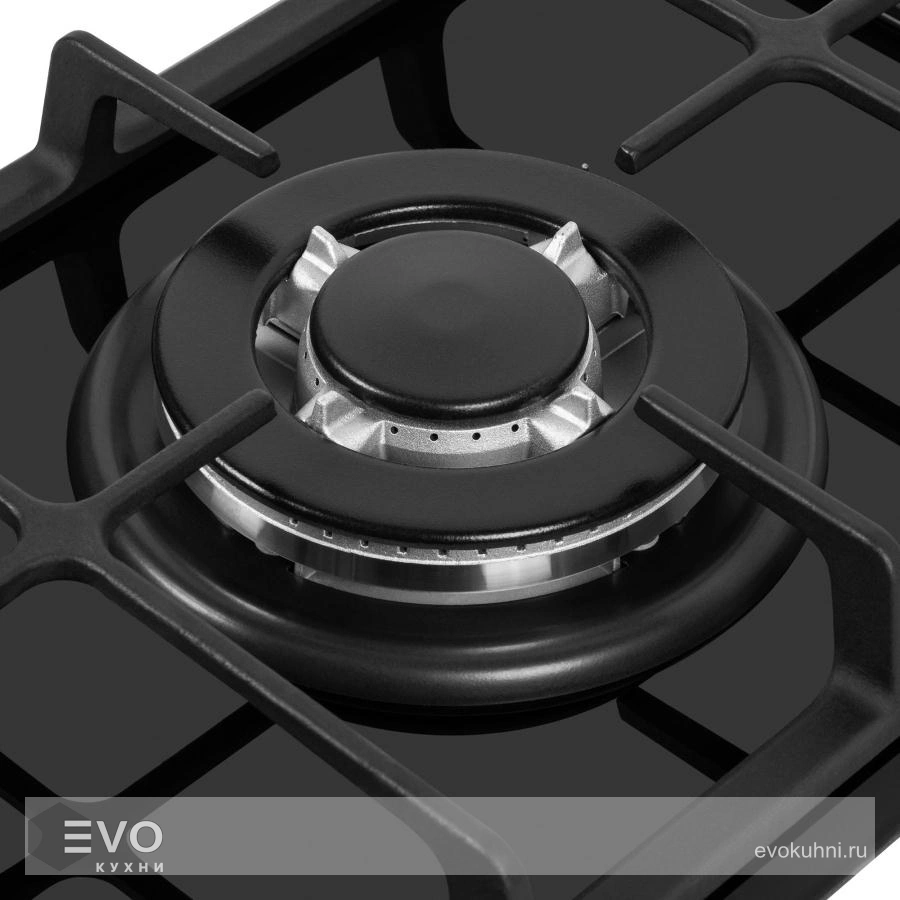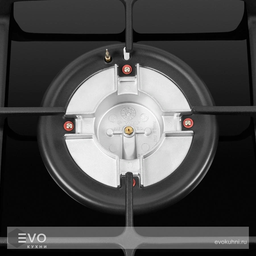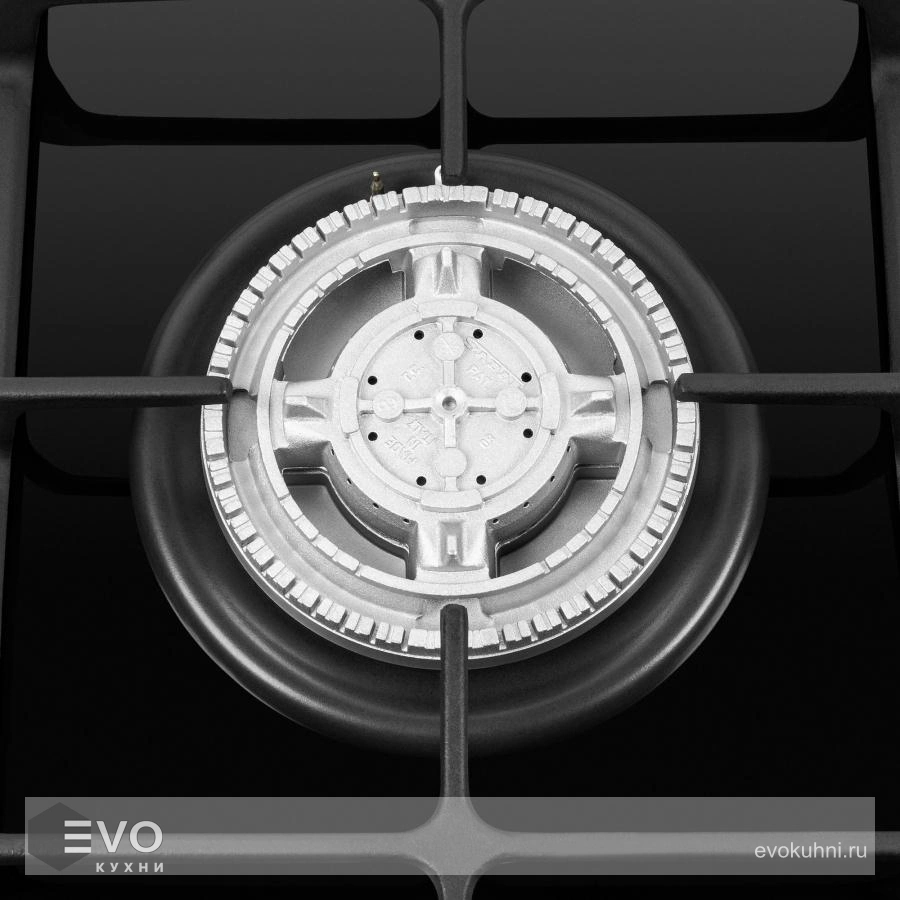 Панель выполнена из термостойкого черного стекла толщиной 8 мм и с фацетом по всему периметру. В данной модели установлена одна супермощная WOK-конфорка (3800 Вт) итальянского производства (Sabaf). Регулирование подачи газа и электоподжиг конфорок происходит с помощью поворотных цельнометаллических регуляторов. Для простоты использования около каждой ручки нанесены информационные изображения: используемая конфорка, подача газа выключена, электроподжиг, максимальное пламя и минимальное пламя.