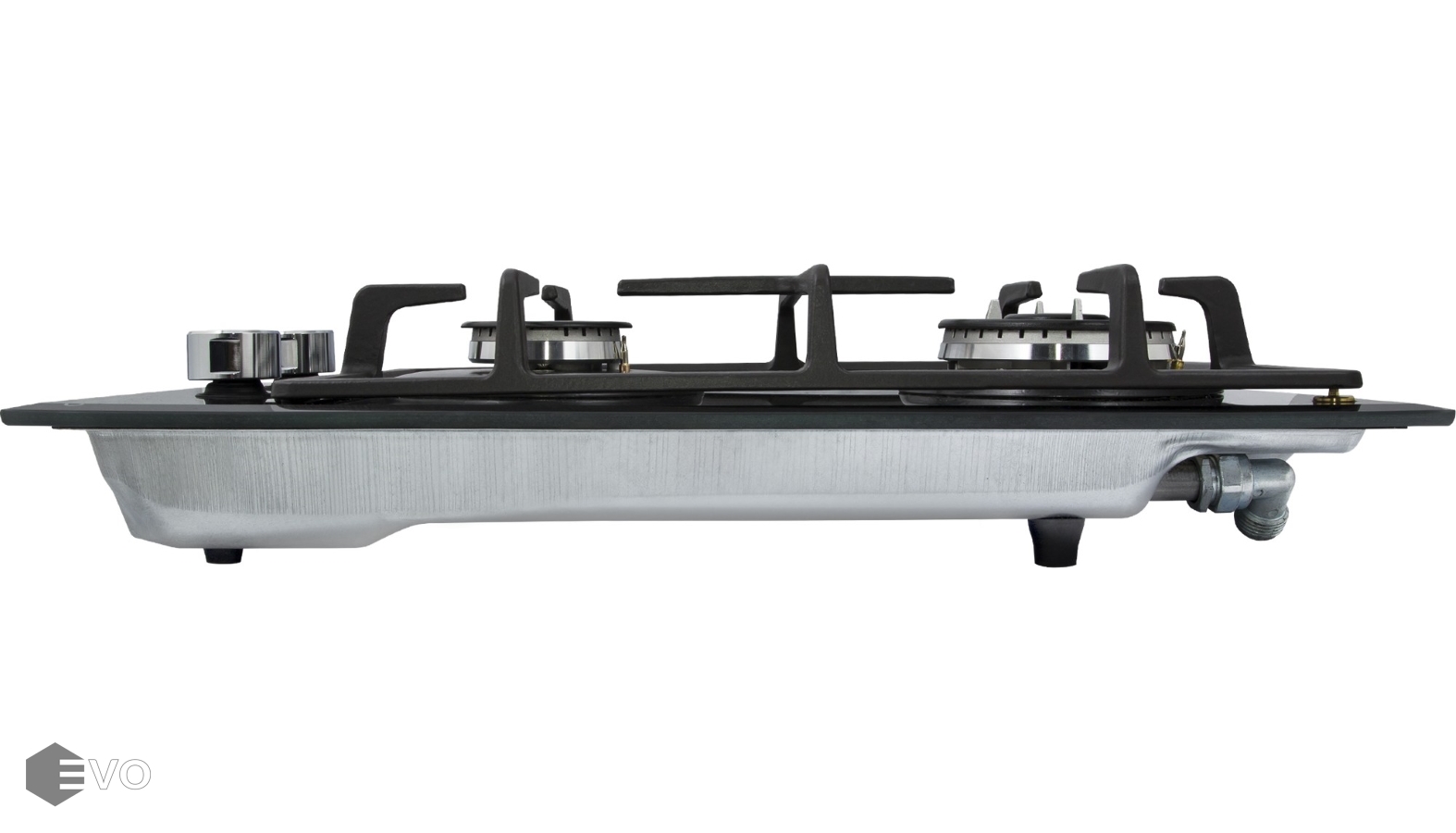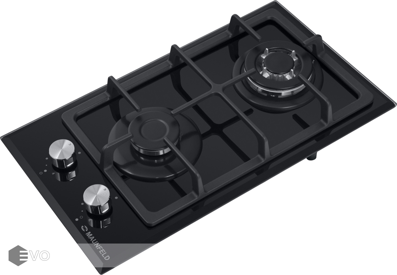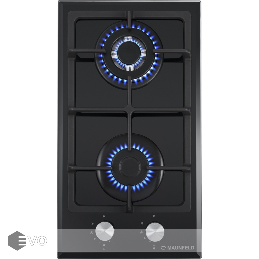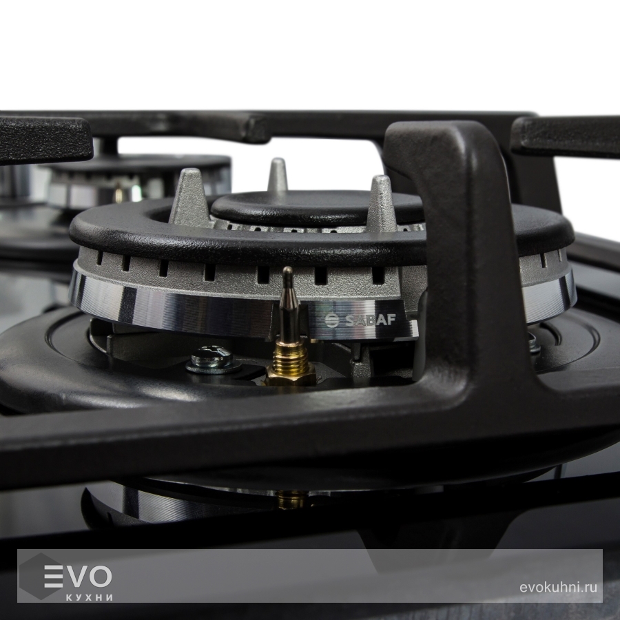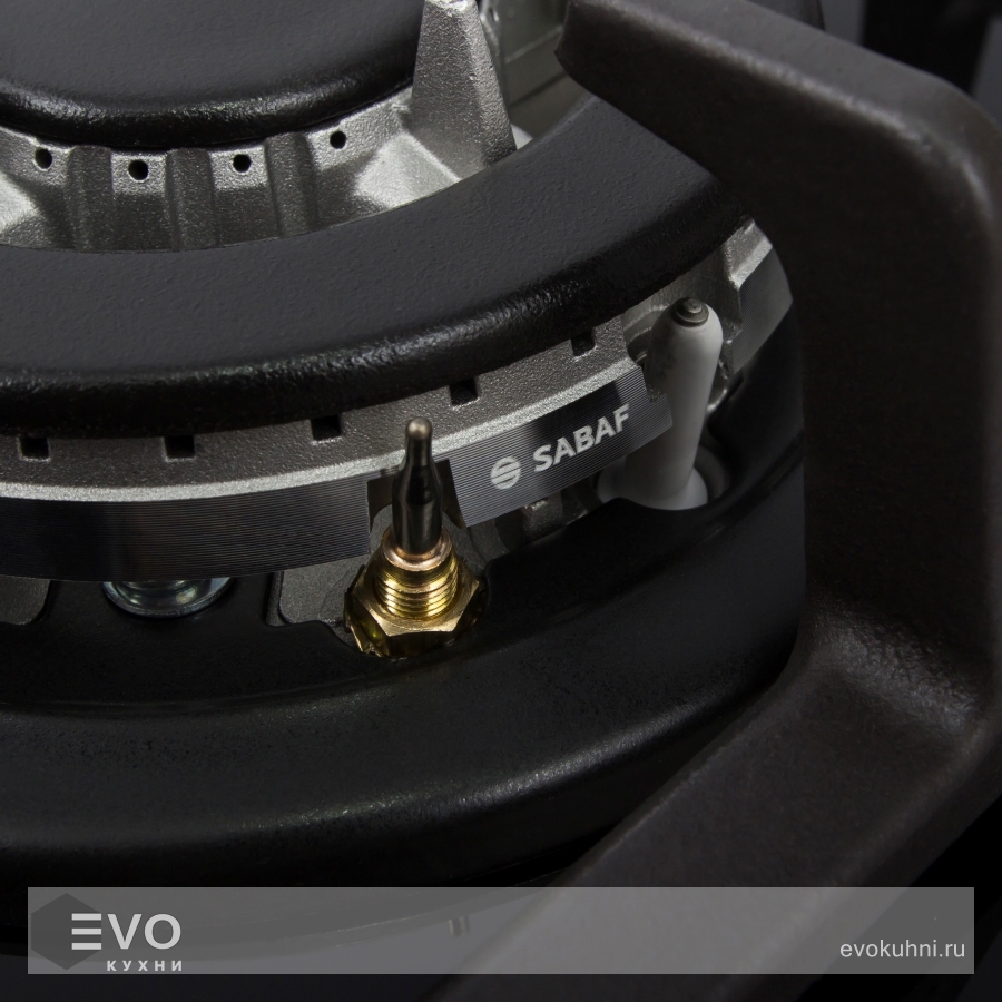 Панель выполнена из термостойкого черного стекла толщиной 8 мм с фацетом по всему периметру. Одна стандартная конфорка мощностью 1700 Вт и одна WOK-конфорка с двойным пламенем мощностью 3000 Вт. В данной модели установлены высококачественные итальянские горелки SABAF. Чугунная решетка надежно защищает стеклянную поверхность плиты. Регулирование подачи газа и электоподжиг конфорок происходит с помощью поворотных цельнометаллических регуляторов. Для простоты использования около каждой ручки нанесены информационные изображения: используемая конфорка, подача газа выключена, электроподжиг, максимальное пламя и минимальное пламя.