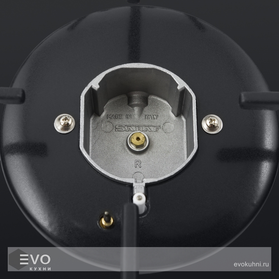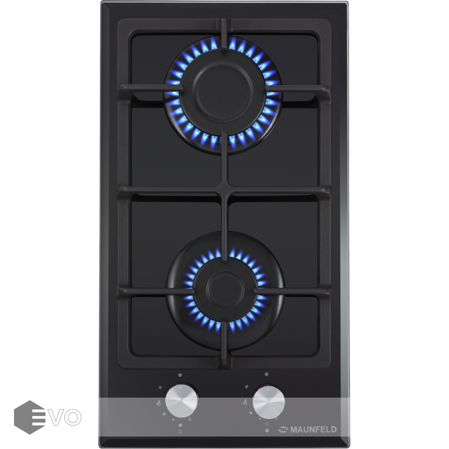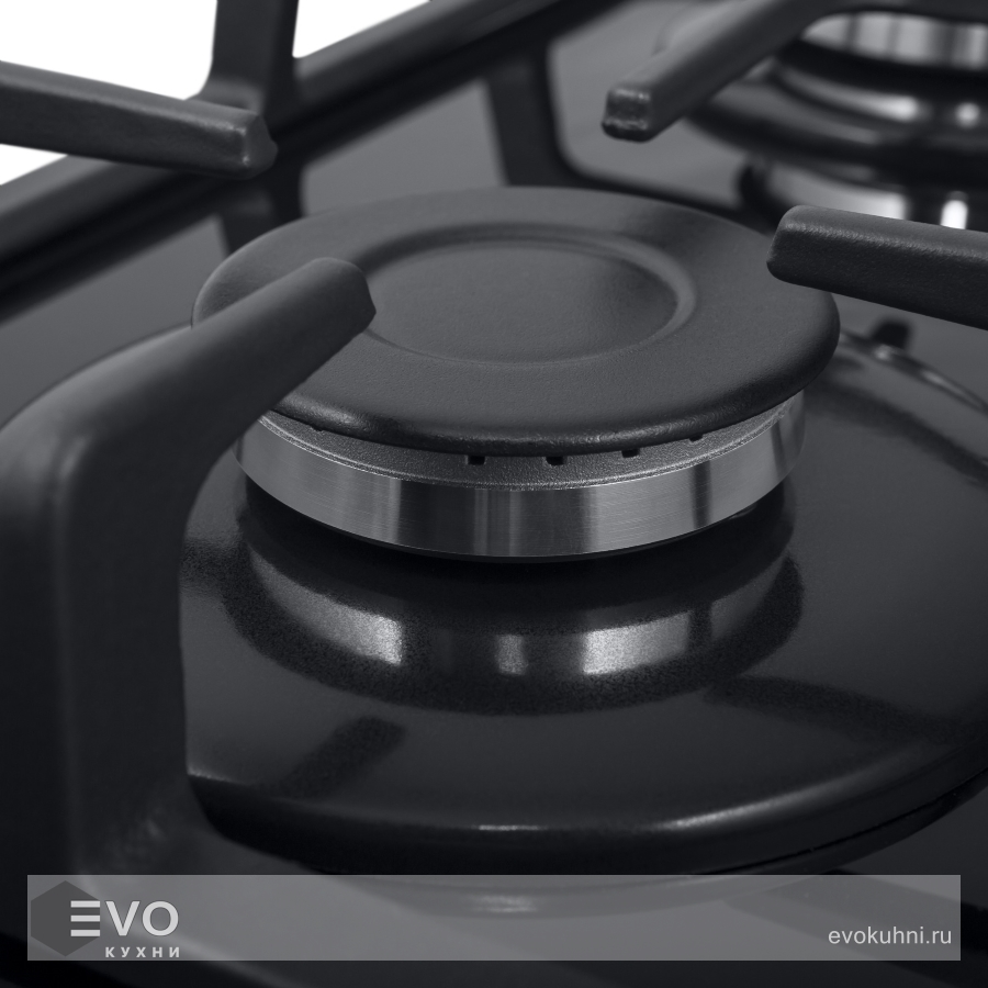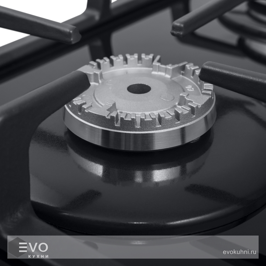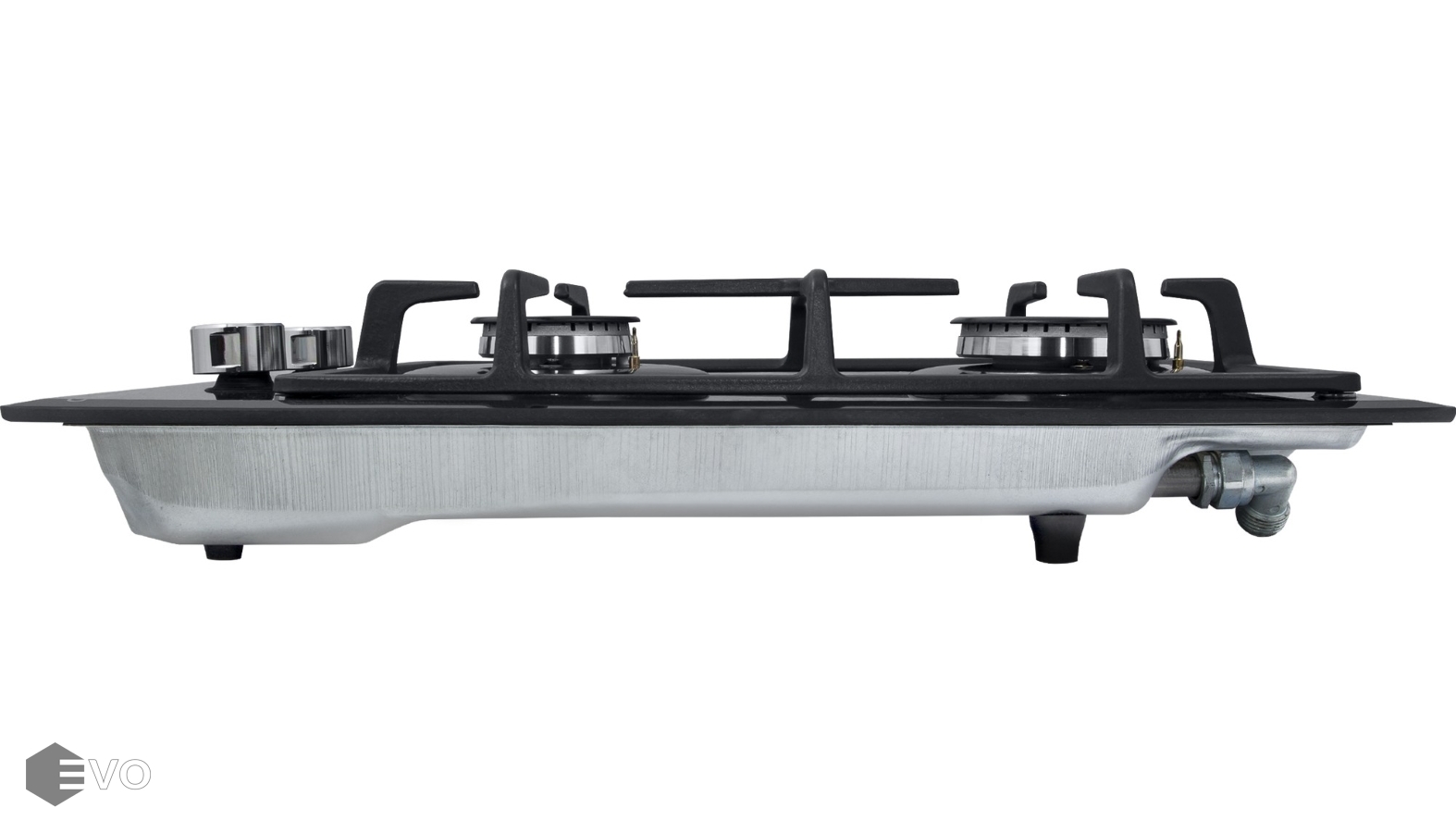 Панель черного цвета выполнена из термостойкого стекла толщиной 8 мм. В данной модели установлены высококачественные итальянские горелки SABAF. Две конфорки разного диаметра с мощностью 1700 Вт и 2600 Вт. Чугунная решетка, общая на две конфорки, выполнена таким образом, что не оставляет царапин на гладкой стеклянной поверхности. Регулирование подачи газа и электоподжиг конфорок происходит с помощью поворотных цельнометаллических регуляторов. Для простоты использования около каждой ручки нанесены информационные изображения: используемая конфорка, подача газа выключена, электроподжиг, максимальное пламя и минимальное пламя.