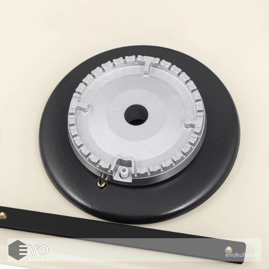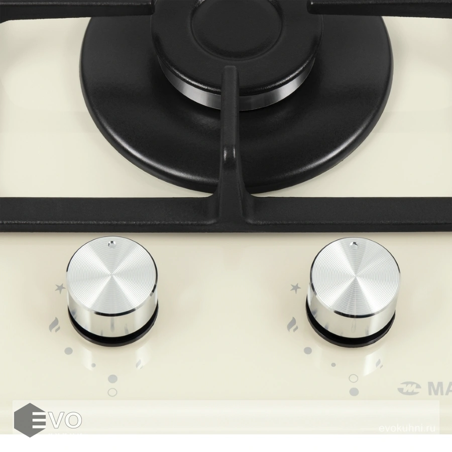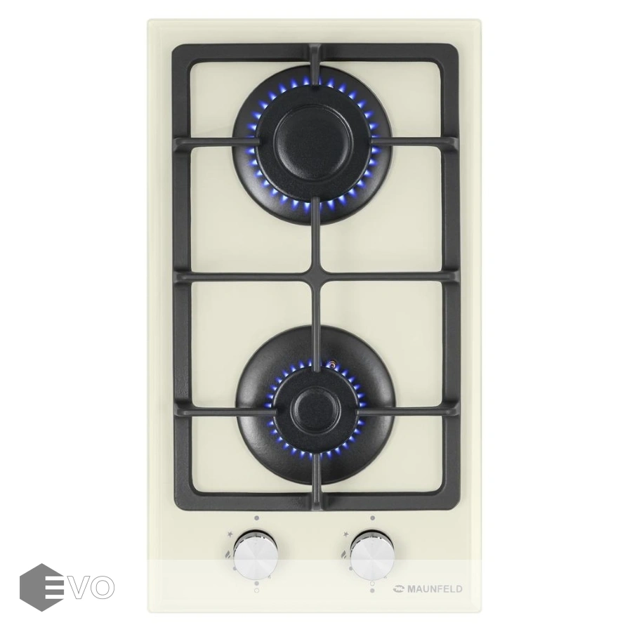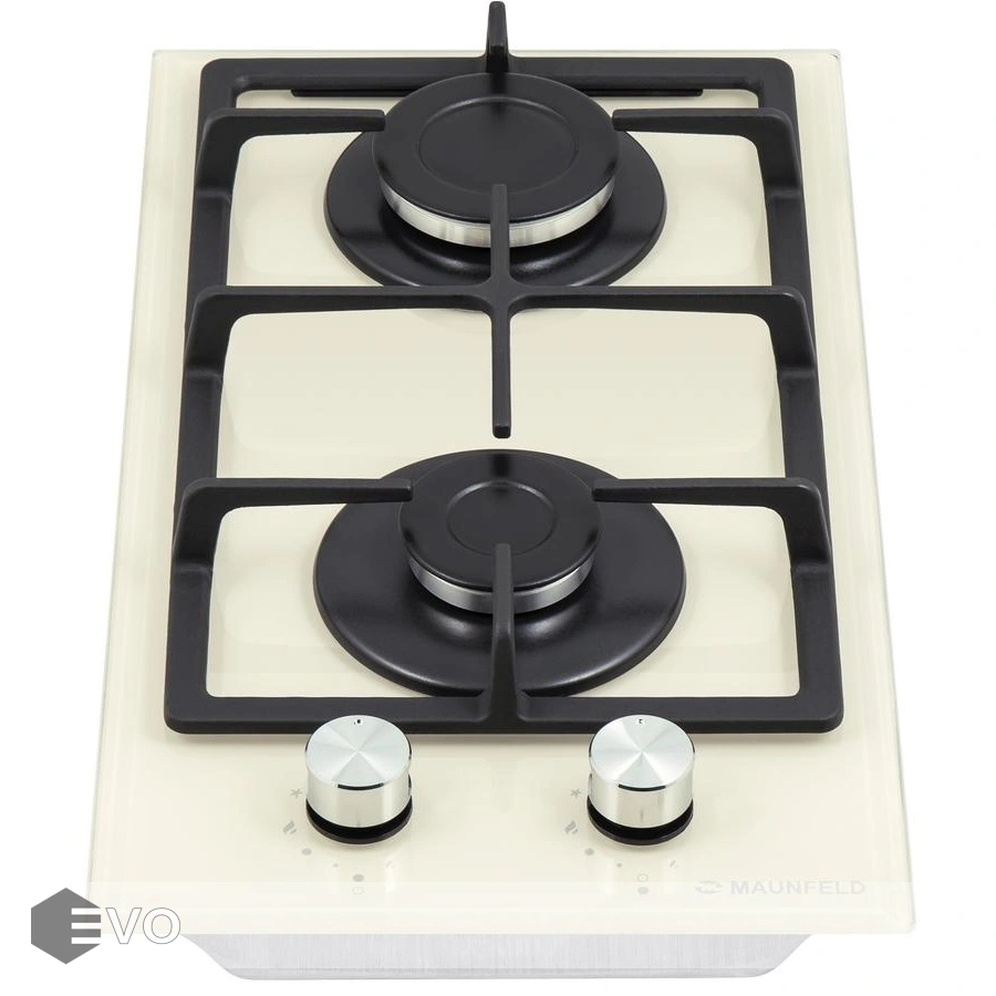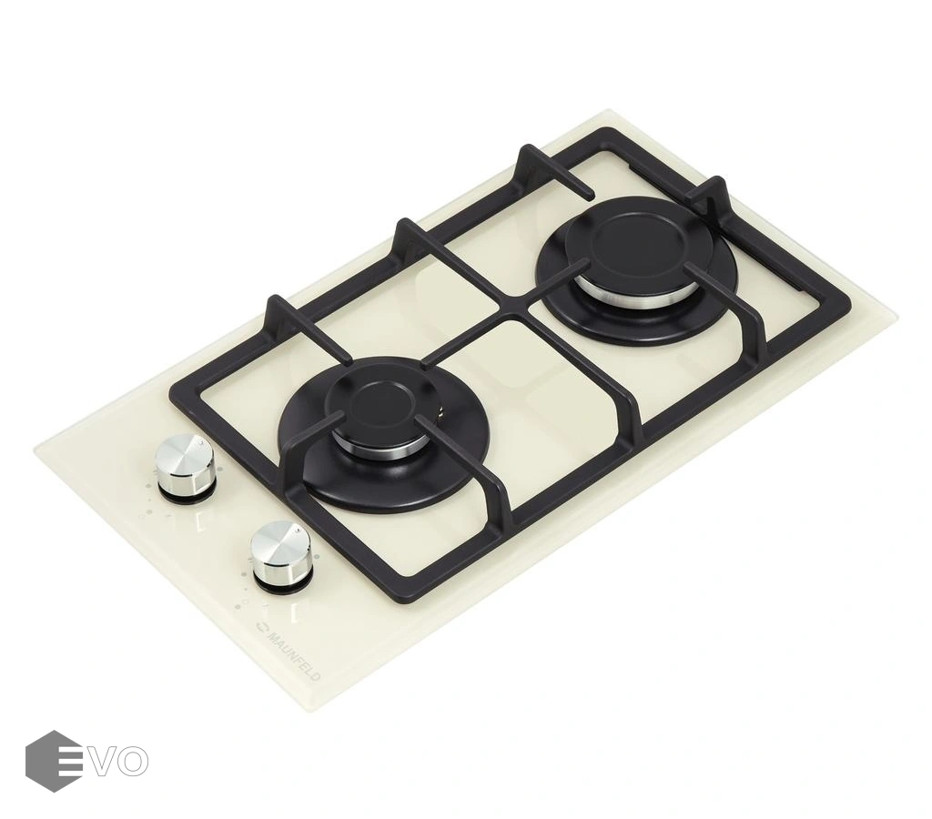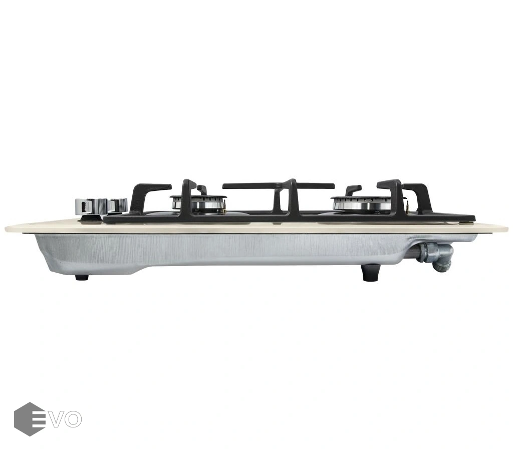 Панель бежевого цвета выполнена из термостойкого стекла толщиной 8 мм. В данной модели установлены высококачественные итальянские горелки SABAF. Две конфорки разного диаметра с мощностью 1700 Вт и 2600 Вт. Чугунная решетка, общая на две конфорки, выполнена таким образом, что не оставляет царапин на гладкой стеклянной поверхности. Регулирование подачи газа и электоподжиг конфорок происходит с помощью поворотных цельнометаллических регуляторов. Для простоты использования около каждой ручки нанесены информационные изображения: используемая конфорка, подача газа выключена, электроподжиг, максимальное пламя и минимальное пламя.
