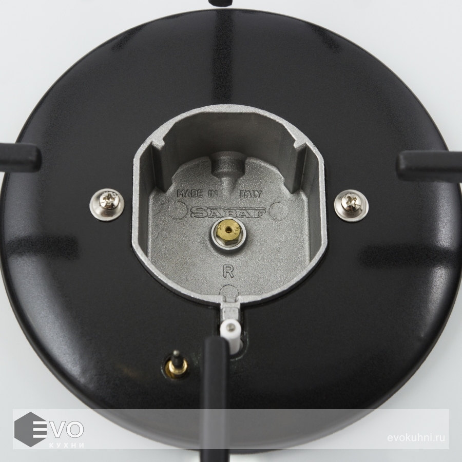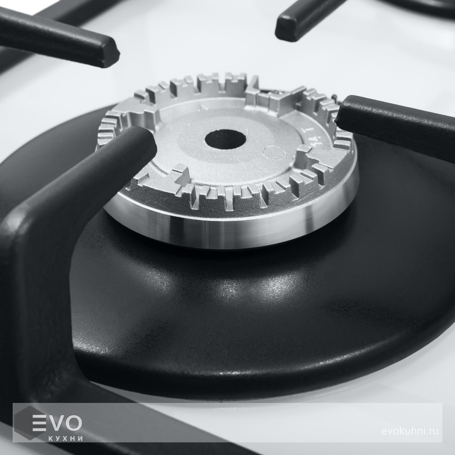 Панель выполнена из термостойкого стекла белого цвета толщиной 8 мм. В данной модели установлены высококачественные итальянские горелки SABAF. Две конфорки разного диаметра с мощностью 1700 Вт и 2600 Вт. Чугунная решетка, общая на две конфорки, выполнена таким образом, что не оставляет царапин на гладкой стеклянной поверхности. Регулирование подачи газа и электоподжиг конфорок происходит с помощью поворотных цельнометаллических ручек. Для простоты использования около каждой ручки нанесены информационные изображения: используемая конфорка, подача газа выключена, электроподжиг, максимальное пламя и минимальное пламя.