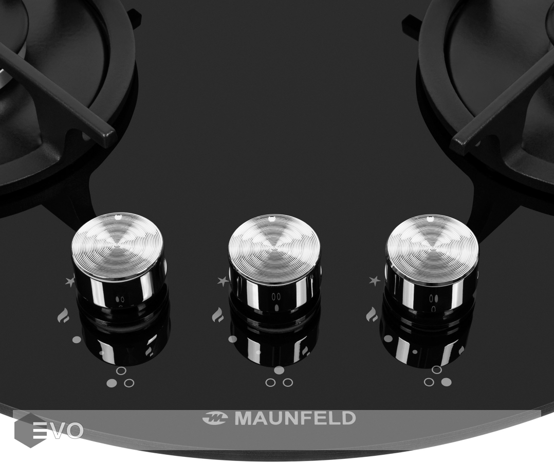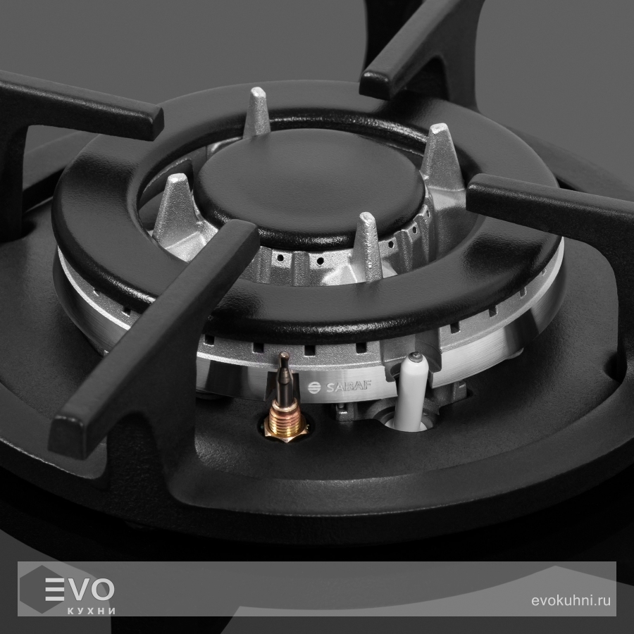 Панель выполнена из закаленного стекла, в данной модели установлены высококачественные итальянские горелки SABAF. Две стандартные конфорки мощностью 1000 Вт и 1700 Вт и одна мощная WOK-конфорка с двойным пламенем мощностью 3000 Вт. Укомплектованы круглыми чугунными решетками. Регулирование подачи газа и электроподжиг конфорок происходит с помощью поворотных полнотелых цельнометаллических ручек. Для простоты использования около каждой ручки нанесены информационные изображения: используемая конфорка, подача газа выключена, электроподжиг, максимальное пламя и минимальное пламя.