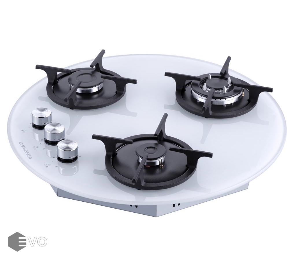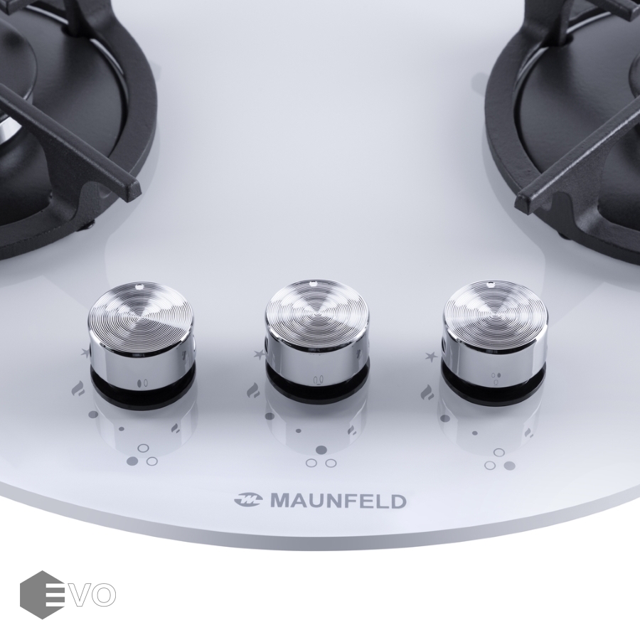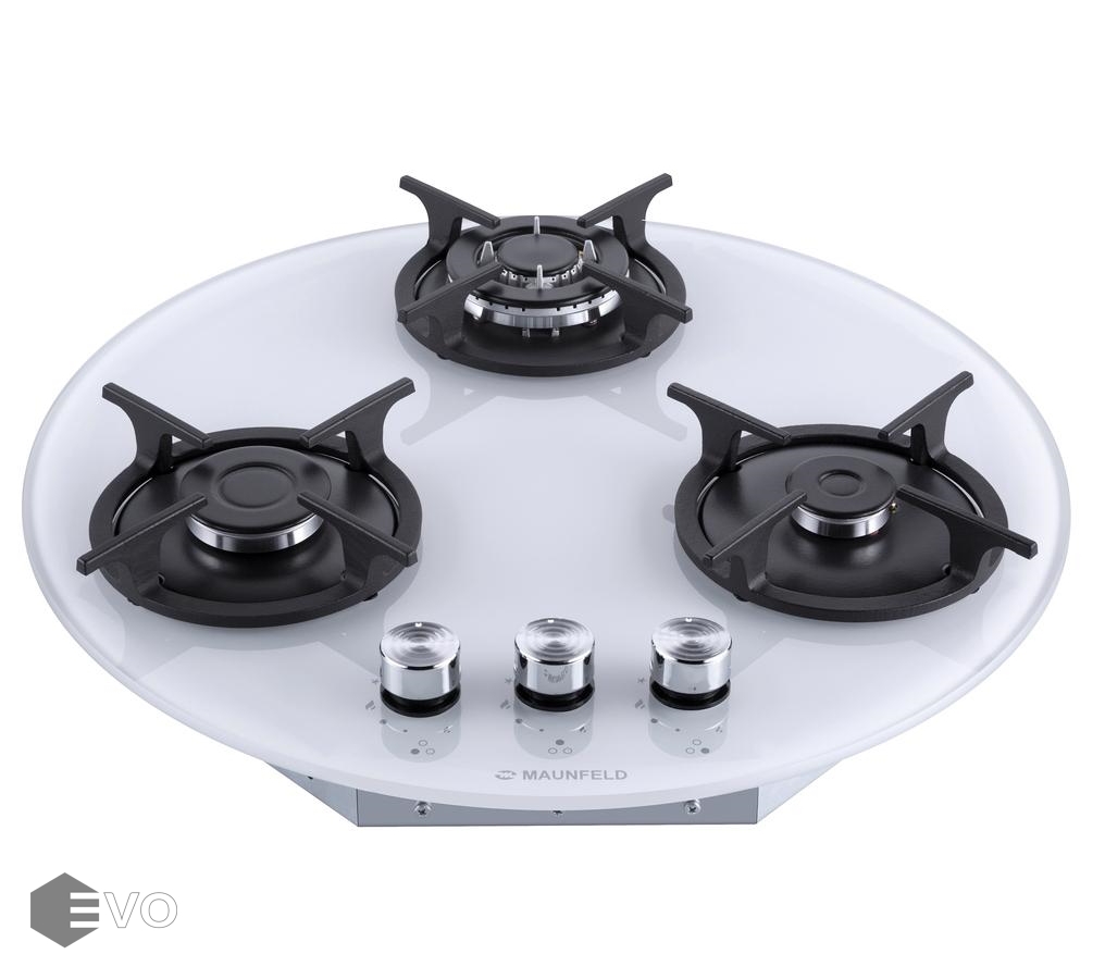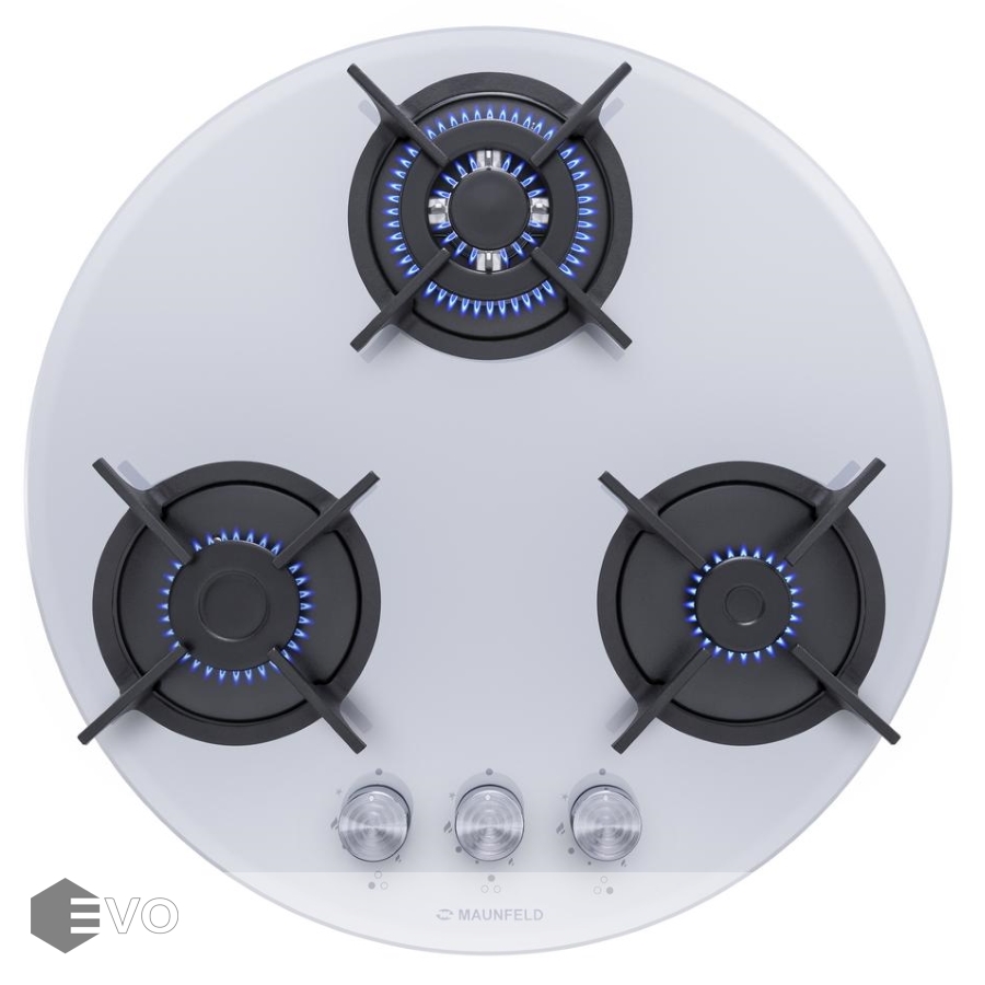 Газовая варочная поверхность MAUNFELD EGHG.43.23CW/G – круглая встраиваемая газовая варочная панель шириной 54 см идеальное решение для угловой столешницы. Может работать от магистрального газа и газа в баллоне (тип G30), для этого достаточно поставить специальные жиклеры, находящиеся в комплекте.
