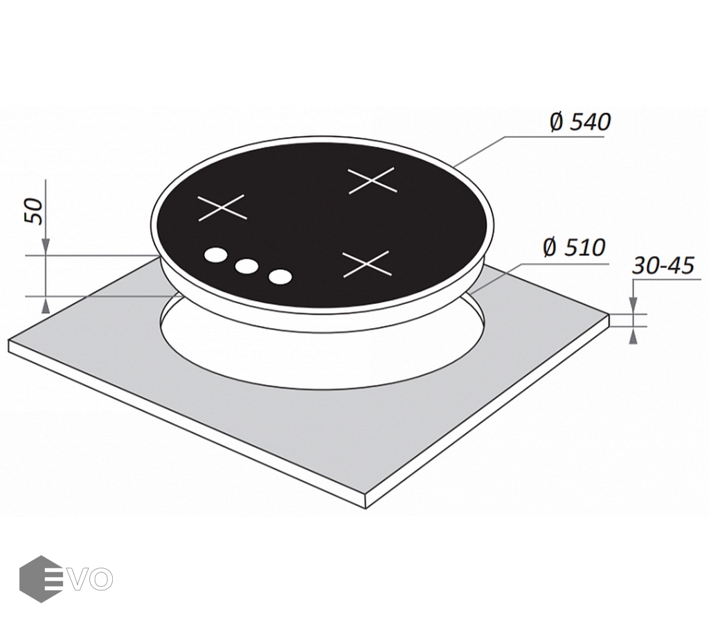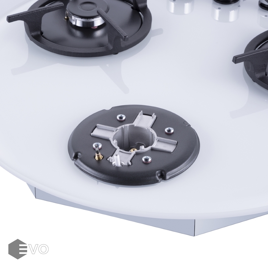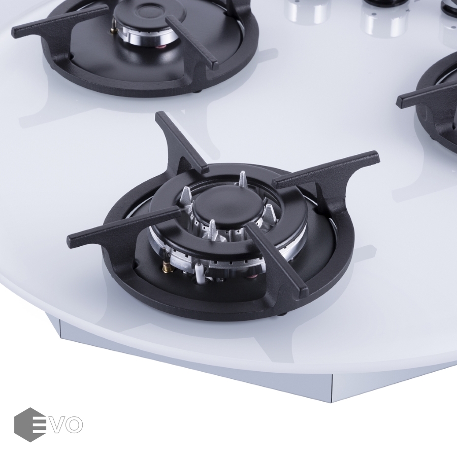 Панель выполнена из закаленного стекла, в данной модели установлены высококачественные итальянские горелки SABAF. Две стандартные конфорки мощностью 1000 Вт и 1700 Вт и одна мощная WOK-конфорка с двойным пламенем мощностью 3000 Вт. Укомплектованы круглыми чугунными решетками. Регулирование подачи газа и электроподжиг конфорок происходит с помощью поворотных полнотелых цельнометаллических ручек. Для простоты использования около каждой ручки нанесены информационные изображения: используемая конфорка, подача газа выключена, электроподжиг, максимальное пламя и минимальное пламя.