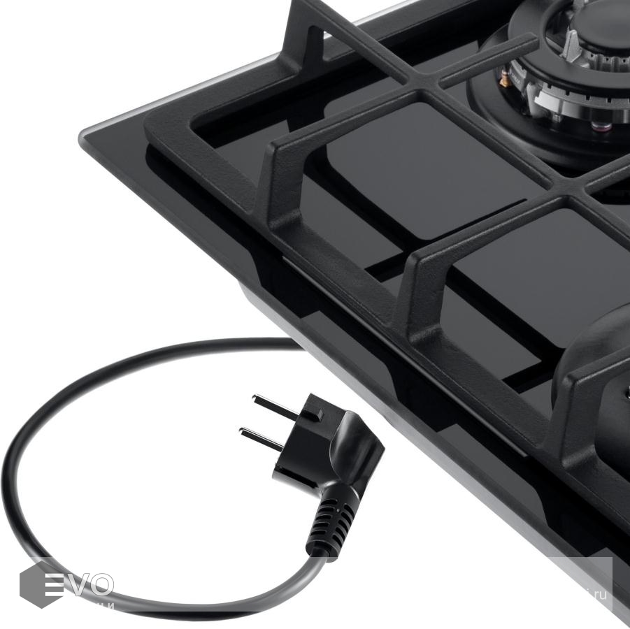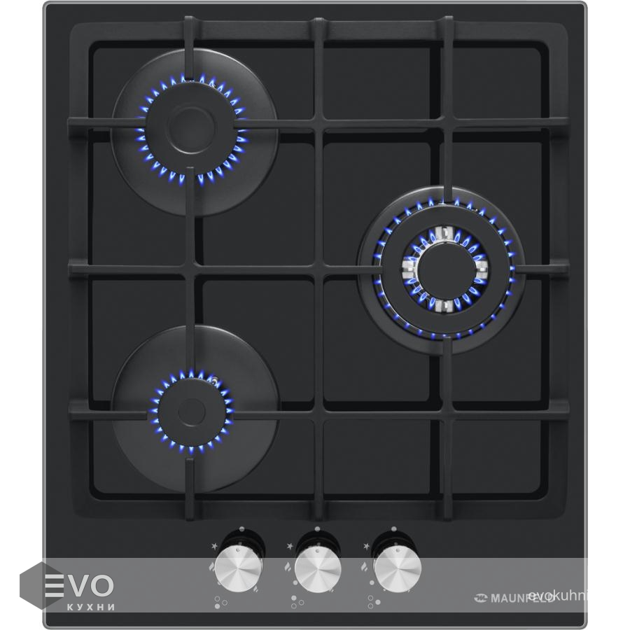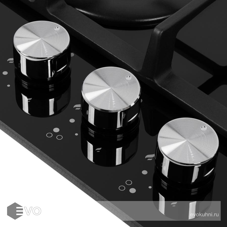 Панель выполнена из закаленного стекла черного цвета. В данной модели установлены итальянские горелки SABAF. Две стандартные конфорки мощностью 1000 Вт, 1700 Вт и одна мощная WOK-конфорка с двойным пламенем мощностью 3000 Вт. Они спроектированы таким образом, что огонь не перегревает ни чугунные решетки, ни ручки управления. Регулирование подачи газа и электроподжиг конфорок происходит с помощью поворотных цельнометаллических ручек. Для простоты использования около каждой нанесены информационные изображения: используемая конфорка, подача газа выключена, электроподжиг, максимальное пламя и минимальное пламя.