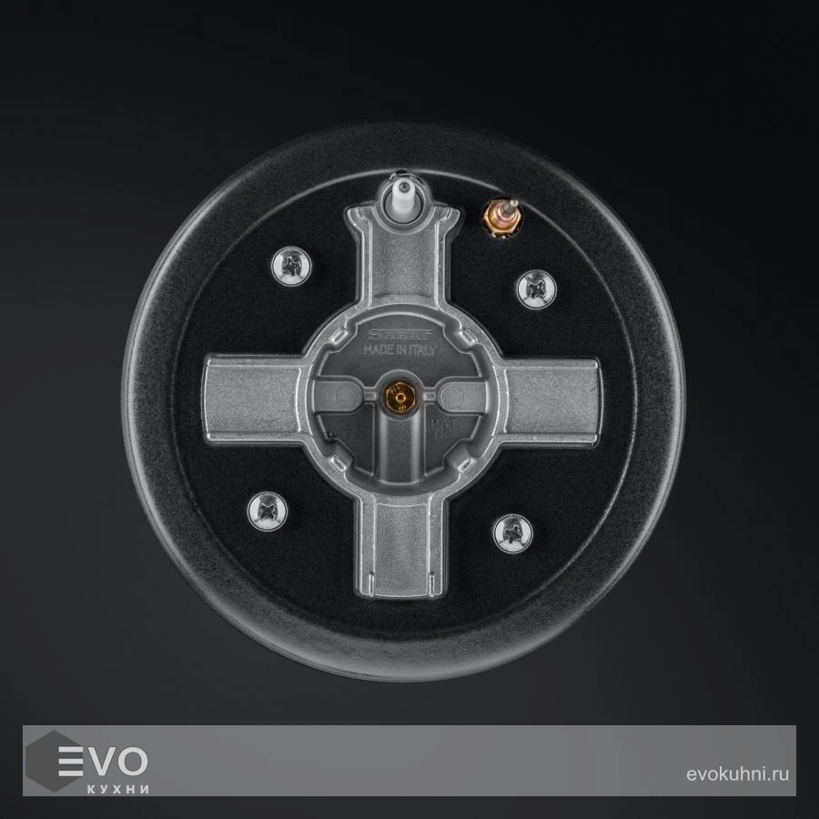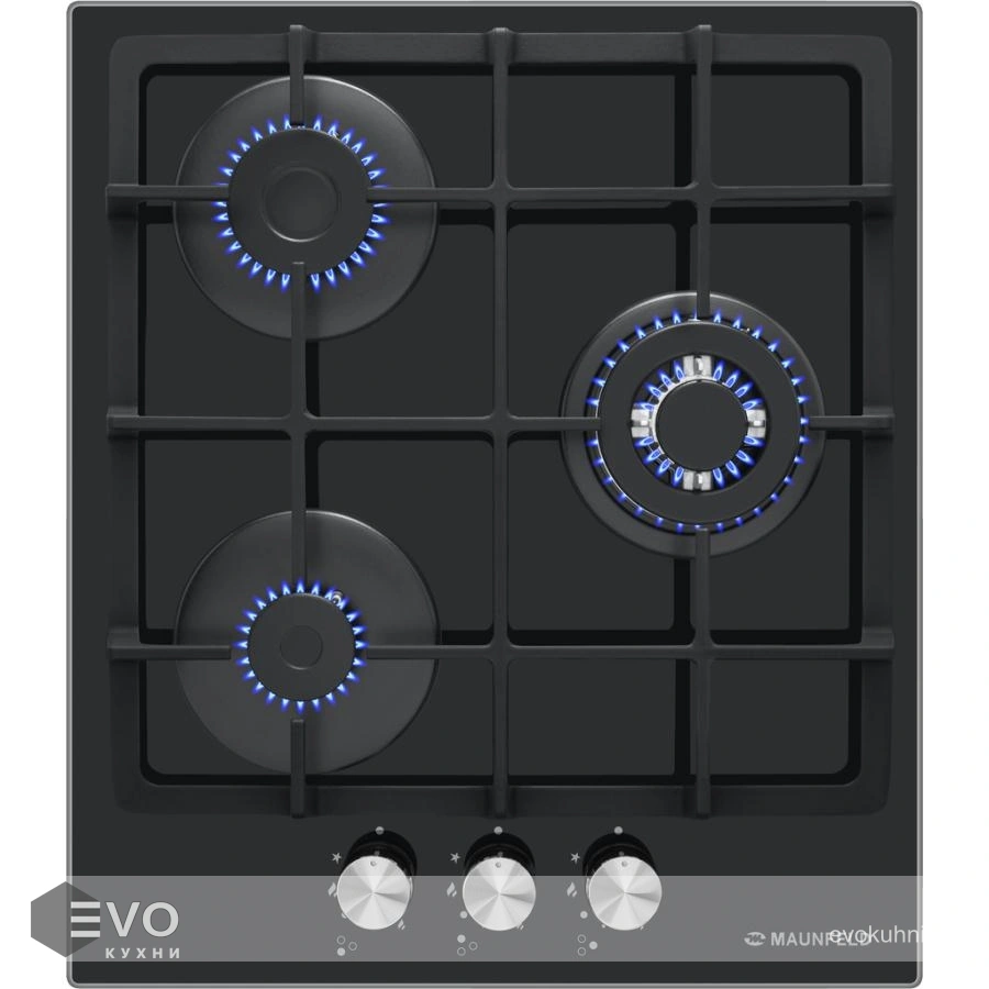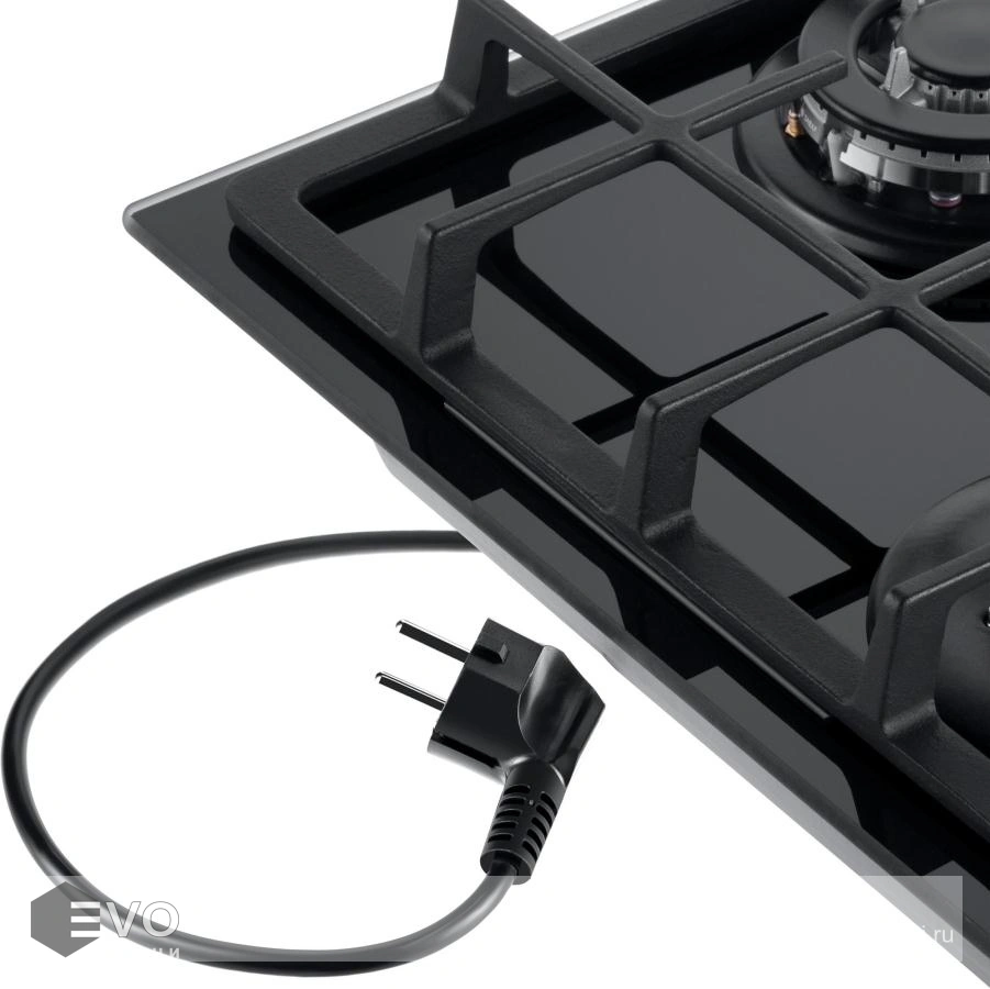 Панель выполнена из закаленного стекла черного цвета. В данной модели установлены итальянские горелки SABAF. Две стандартные конфорки мощностью 1000 Вт, 1700 Вт и одна мощная WOK-конфорка с двойным пламенем мощностью 3000 Вт. Они спроектированы таким образом, что огонь не перегревает ни чугунные решетки, ни ручки управления. Регулирование подачи газа и электроподжиг конфорок происходит с помощью поворотных цельнометаллических ручек. Для простоты использования около каждой нанесены информационные изображения: используемая конфорка, подача газа выключена, электроподжиг, максимальное пламя и минимальное пламя.