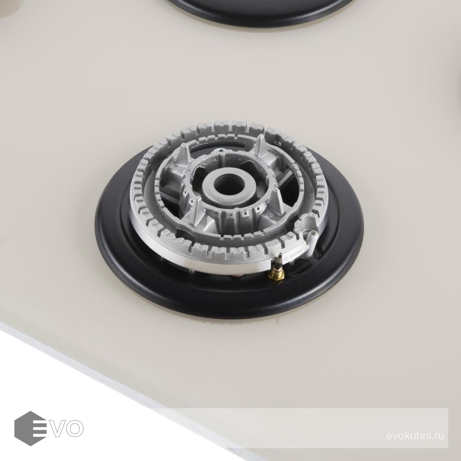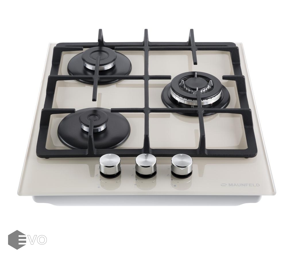 Панель выполнена из закаленного стекла бежевого цвета. В данной модели установлены итальянские горелки SABAF. Две стандартные конфорки мощностью 1000 Вт, 1700 Вт и одна мощная WOK-конфорка с двойным пламенем мощностью 3000 Вт. Они спроектированы таким образом, что огонь не перегревает ни чугунные решетки, ни ручки управления.