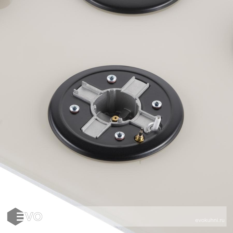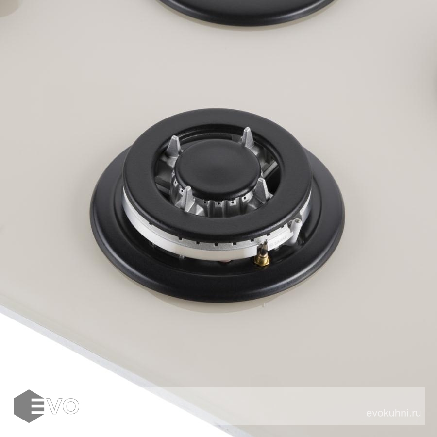 Панель выполнена из закаленного стекла цвета слоновой кости. В данной модели установлены итальянские горелки SABAF. Две стандартные конфорки мощностью 1000 Вт, 1700 Вт и одна мощная WOK-конфорка с двойным пламенем мощностью 3000 Вт. Они спроектированы таким образом, что огонь не перегревает ни чугунные решетки, ни ручки управления.